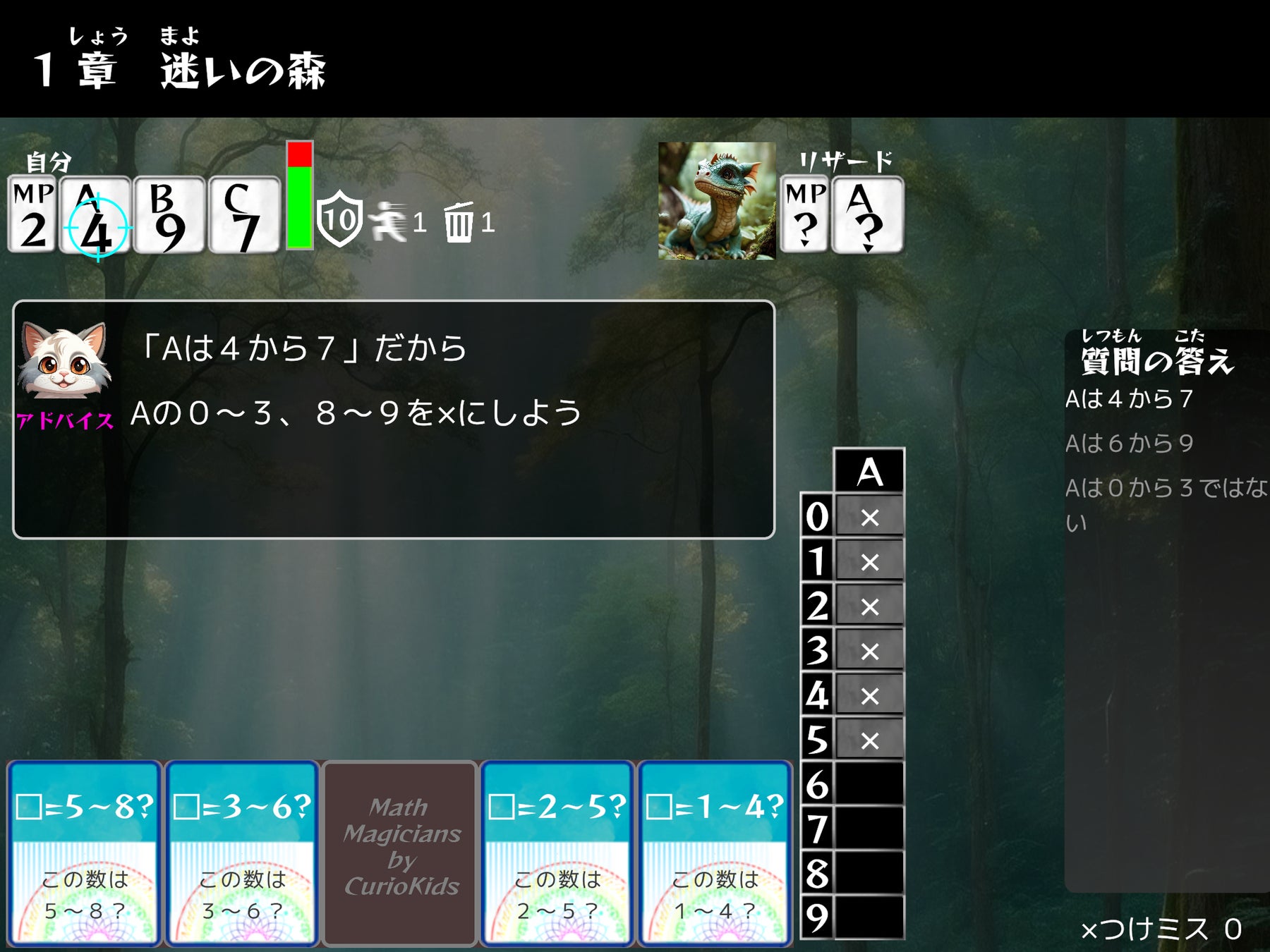 『マスマジシャン』は元々は2009年に発売された、論理的思考力と計算力を同時に育むアナログの算数ゲームです。「2つの数をかけると48より大きい?」「これは奇数?」「2以下の数はある?」など50種類以上の数学的な質問をして情報を集めて数当てをします。Amazonで評価★4.5(2020年度版)を獲得し、算数オリンピック数理教室「アルゴクラブ」の教材にも採用されるなど、教育関係者や保護者から高い支持を得てきました。