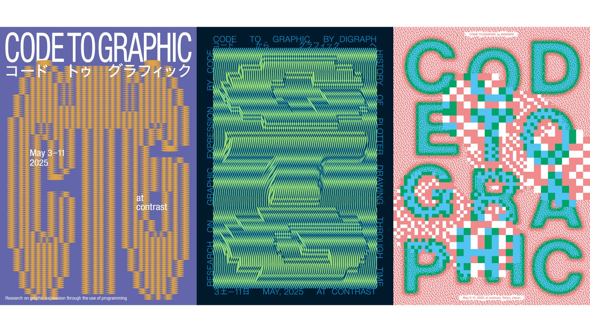 本展は、デザイナー深地宏昌とプログラマー堀川淳一郎が結成したクリエイティブスタジオDIGRAPH(ディグラフ)によるもので、DIGRAPHのグラフィック手法の特徴である「CODE TO GRAPHIC=プログラミング(コード)を使ってグラフィックを作る」をテーマに、多種多様なプログラミングから生まれる美しさや個性を活かしたグラフィック作品群を発表します。作品の描画にはDIGRAPHの代表的手法である、デジタルとフィジカルの境界を探る表現技法「Plotter Drawing(プロッタードローイング)」を用い、ディスプレイ上のデジタルデータや印刷物には見られない物理的なゆらぎや唯一無二の表情を作品に内包させています。