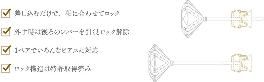 日常の中で、大切なピアスを安心して楽しみたい方、スポーツやアクティブな活動をしている中でもお気に入りのピアスをしていたい方など、活用の仕方は様々。メーカーや製品によって異なるピアスの軸に自動的にアジャストされるため、一つのピアスキャッチで様々なピアスを長く楽しめるのも特徴です。