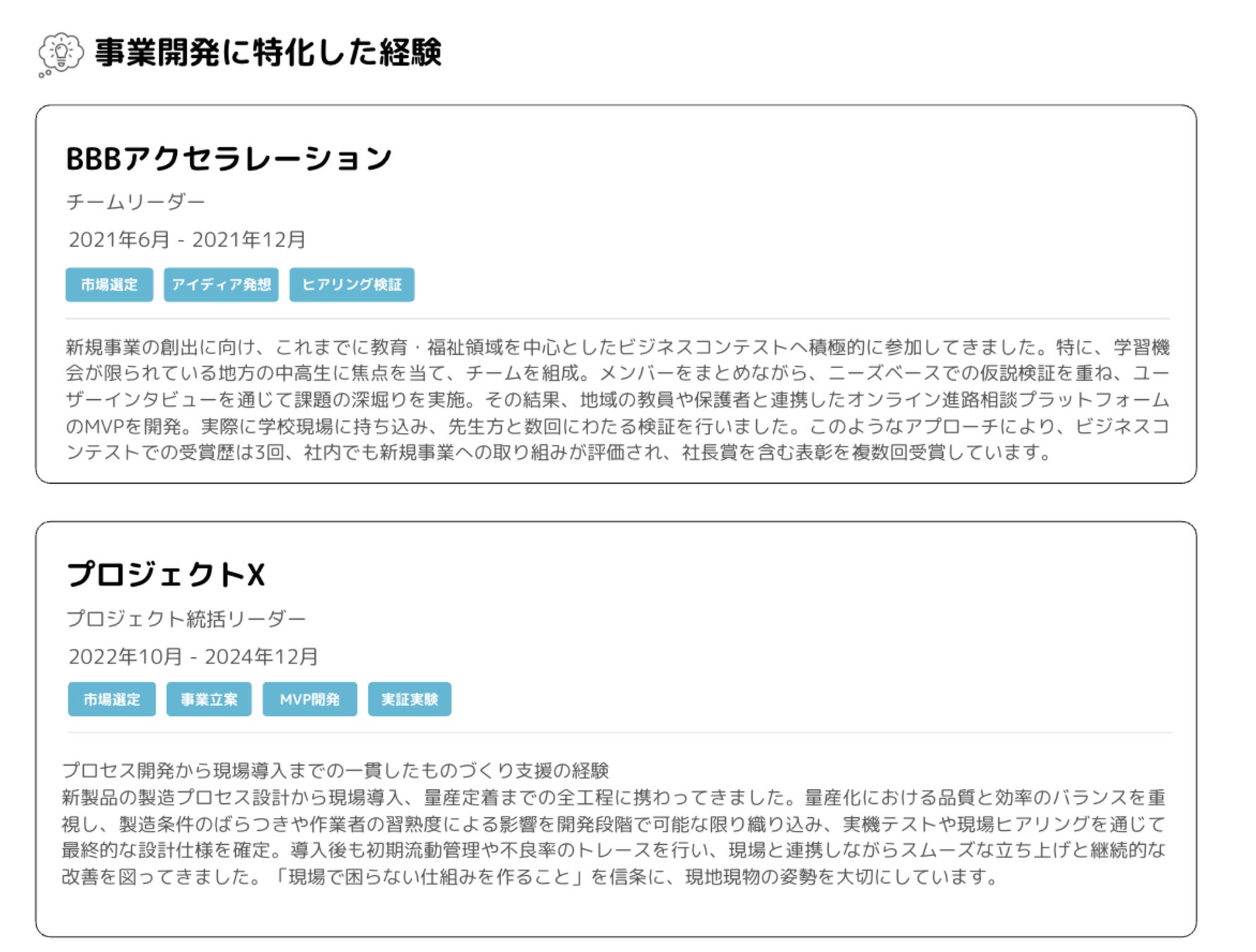 事業開発に特化した経験をピックアップして提示しているからこそ、自社が求める人財要件に適合しているか簡単に判断することが可能です。「0→1でアイディアから創出できる人財」「立ち上がったプロジェクトを1→10で推進できる人財」など効率よく事業開発に必要な人財を見つけることができます。