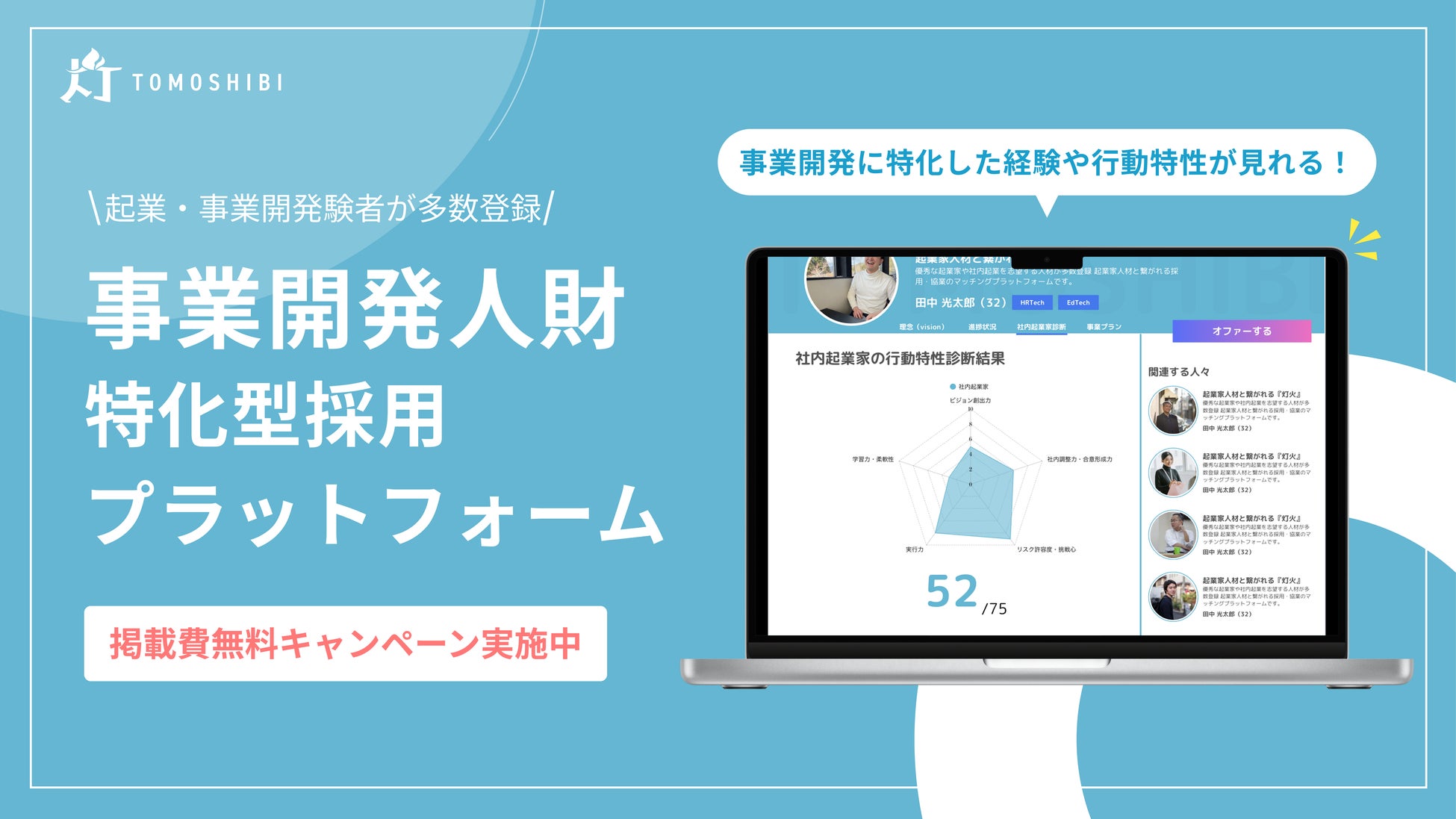 【掲載費無料の特別プランを提供】事業開発ができる人財に特化した採用プラットフォーム『灯火』の事前登録と合わせて、本リリースまでの検証期間を無料でご利用いただける企業様を募集します。