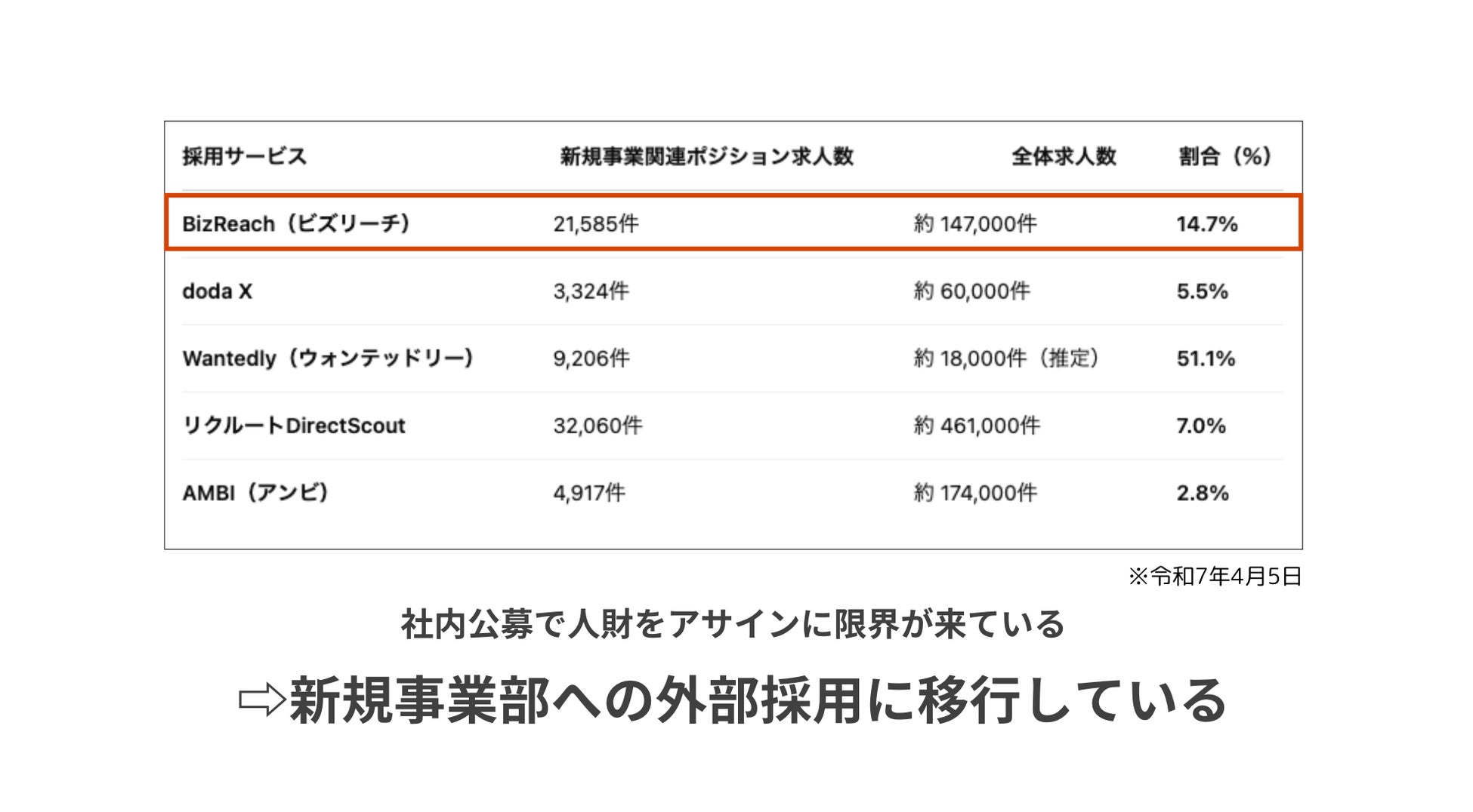 求人市場でも外部採用へシフト(BizReachだけで新規事業関連求人21,585件=全体の14.7%) |
