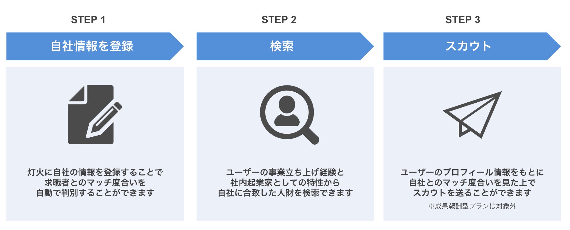 新規事業部ですでに経験を積んでいる人や、すでに事業プランを持っている人のみが登録できるため、新規事業部所属、ビジネスコンテスト出場経験あり、過去に起業経験があるなど、事業開発ができる優秀な人財が集まっていることが灯火ユーザーの特徴です。