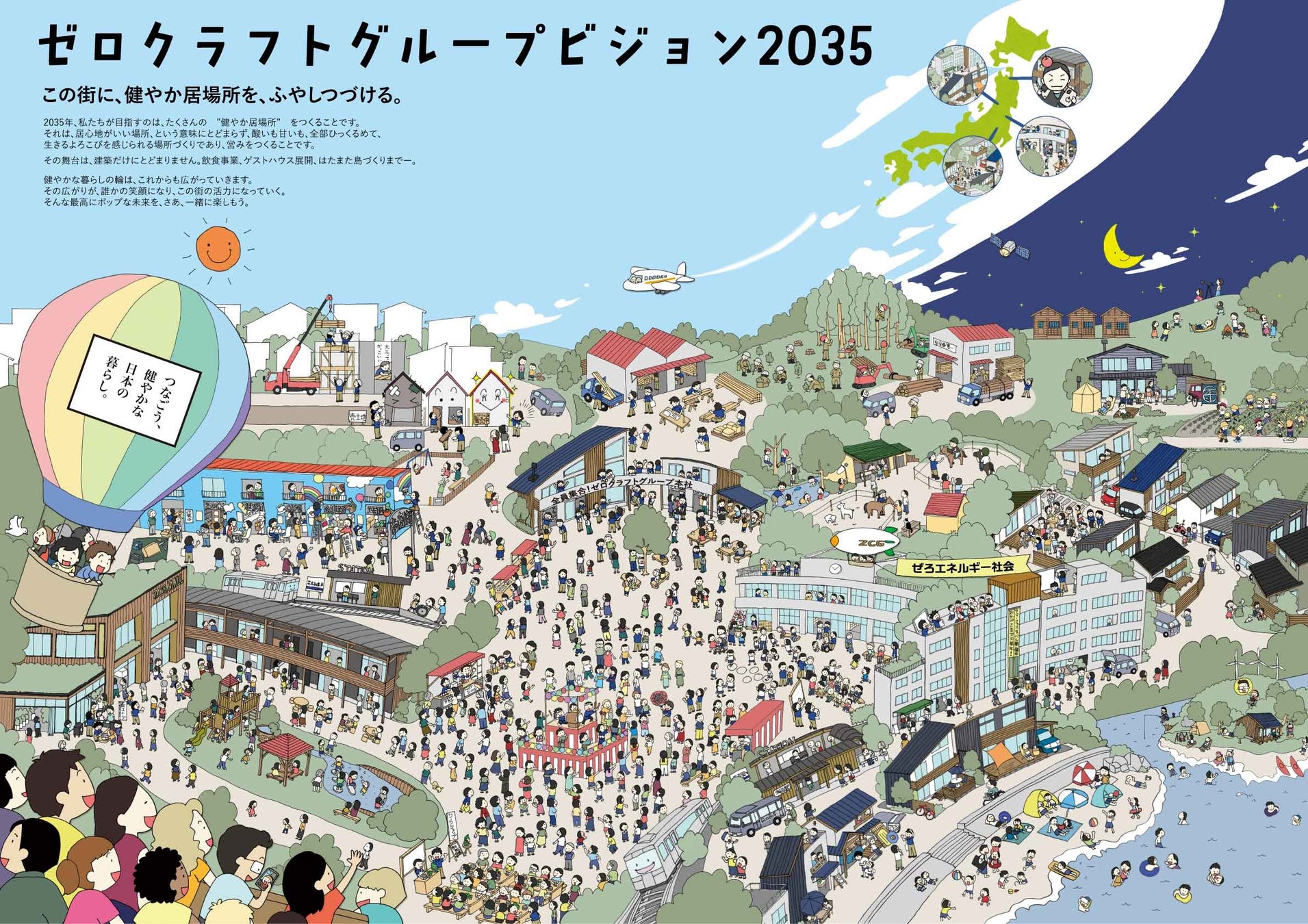 ゼロクラフトグループが目指す方向性や、地域社会でどのような位置付けになっているかなどを視覚的に共有することを目的とした「ゼロクラフトグループビジョン2035」をお披露目しました。数年にわたる検討を経て、ビジョンのテーマは「たくさんの”健やか居場所”をつくること」とし、構成・文章・イラスト全てを社内スタッフで作成しました。