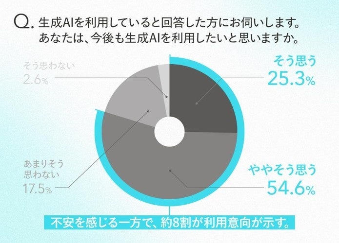 信頼性に対する不安を感じている方の中でも、今後も生成AIを利用し続けると回答した割合は79.9%に達しています。