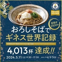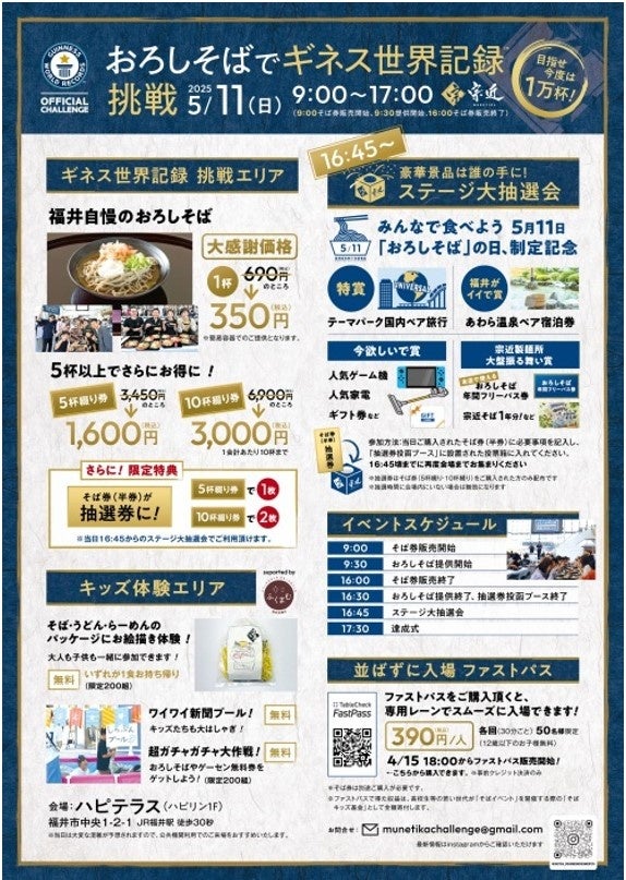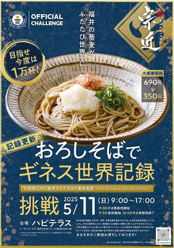 株式会社宗近(福井県越前市北町45-63-1)は、2025年5月11日におろしそばでギネス世界記録 記録大幅増を目指し『再』挑戦することに致しました。