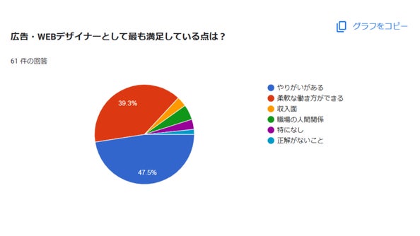仕事のやりがいや柔軟な働き方が結果の大半を締め、広告・Webデザイナーにとって重要なモチベーションとなっていることがわかります。