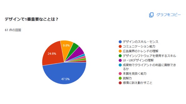 デザインスキル・センスが最も重要視されている一方で、コミュニケーション能力やUI・UXデザインの理解など、デザイン以外の能力も重要であると考えている人が多いようでした。