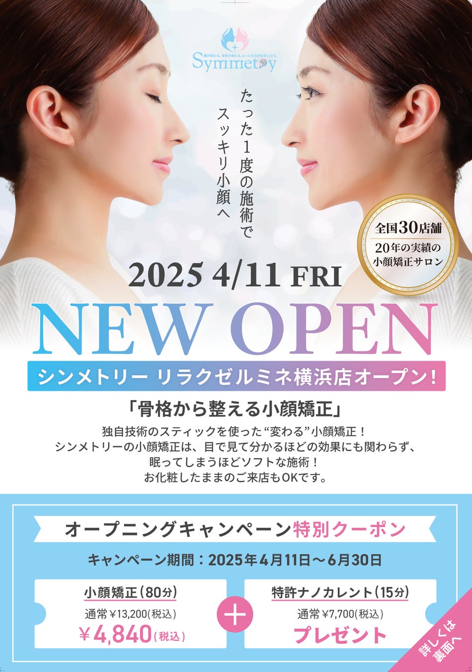シンメトリー リラクゼルミネ横浜店のオープンを記念して、小顔矯正(通常13,200円)と特許波形ナノカレント施術(通常7,700円)の合計20,900円が期間限定で税込4,840円にて体験できる特別キャンペーンを2025年4月11日~6月30日まで実施いたします。