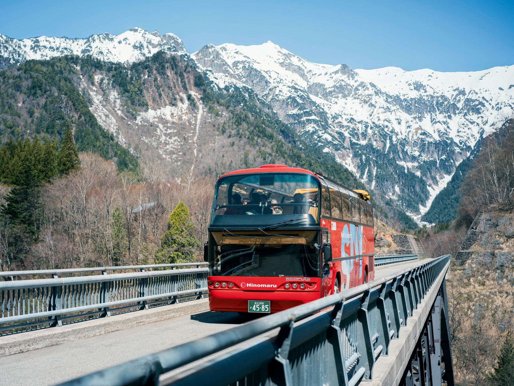 日本百名山として知られる槍ヶ岳や穂高連峰などの峰や、活火山である焼岳と山麓に広がる高原など、奥飛騨温泉郷は日本を代表する山岳地帯に位置しています。バスは、そんな山とともに形成された5つの温泉街を貫くルートを一気に駆け抜けます。