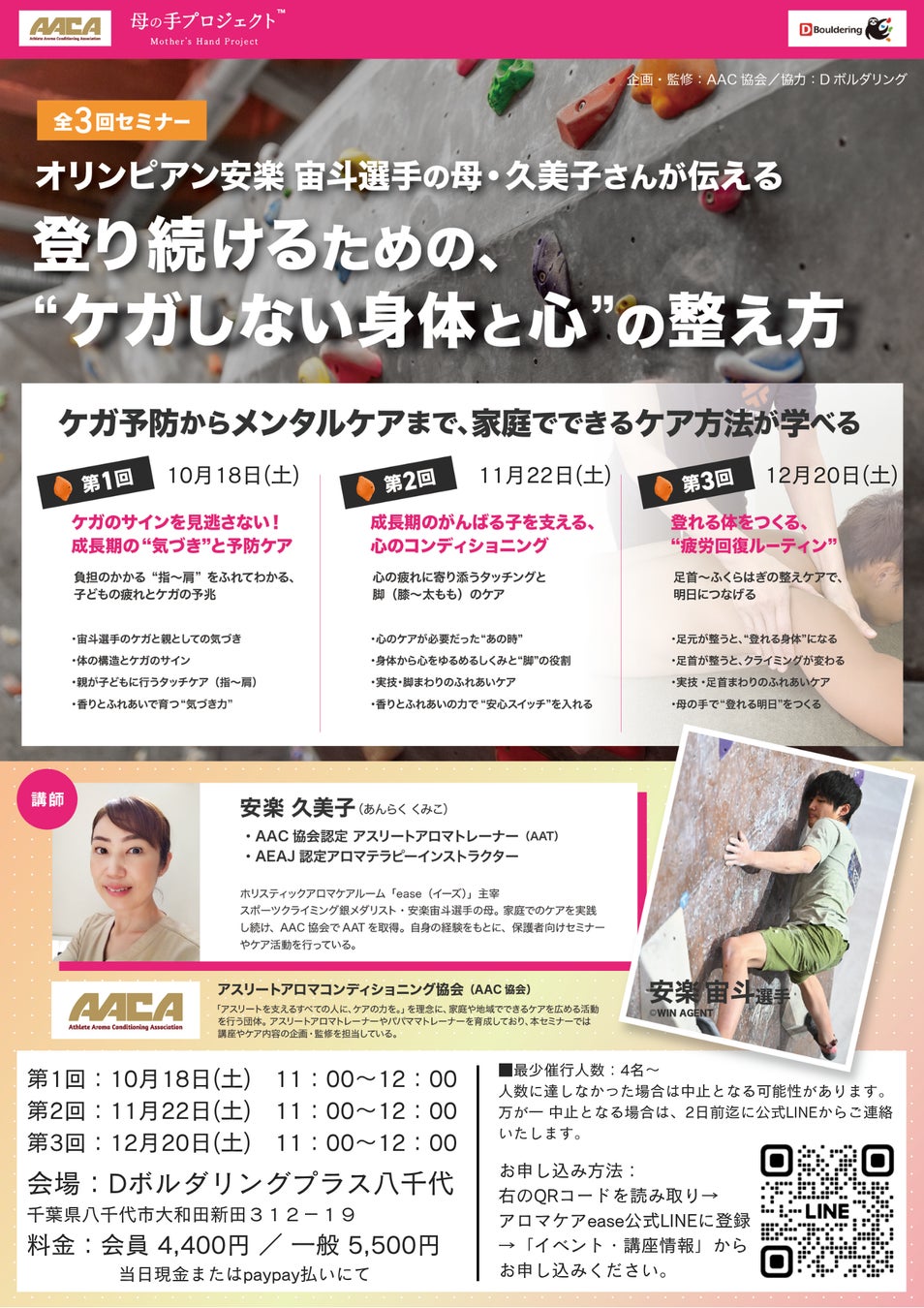 スポーツクライミング パリ2024銀メダリスト・安楽宙斗選手の母であり、アスリートアロマトレーナー(AAT)として活動する安楽久美子さんが、子どもの成長期を支えるための家庭でできるコンディショニングケアセミナーを開講します。会場は、宙斗選手も通う「Dボルダリングプラス八千代」。家庭からアスリートを支える新たな取り組みとして始動する「母の手プロジェクト™」の第一弾企画です。