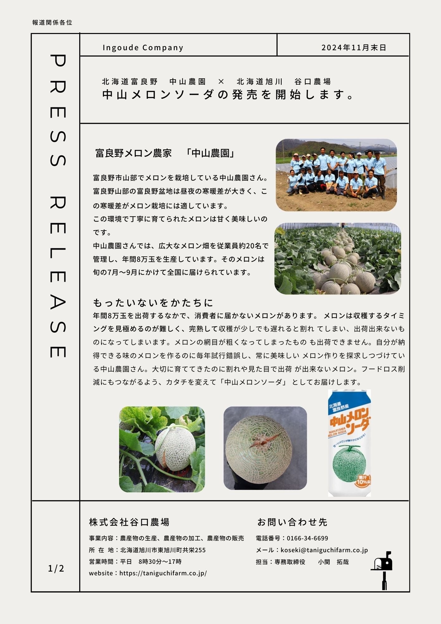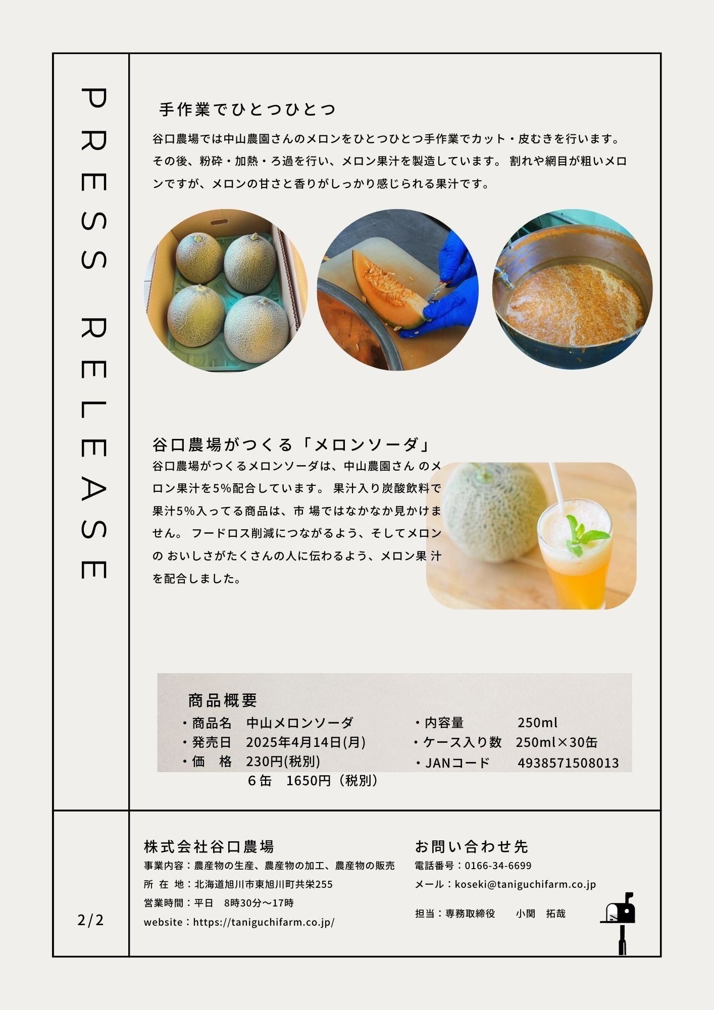 2025年4月14日、株式会社谷口農場(本社:北海道旭川市東旭川町共栄255、代表取締役:谷口威裕)は、富良野中山農園メロンソーダを発表しました。この新たな商品は谷口農場、旭川空港、旭川道の駅、きたキッチン、富良野マルシェ、新千歳空港等にて購入可能です。