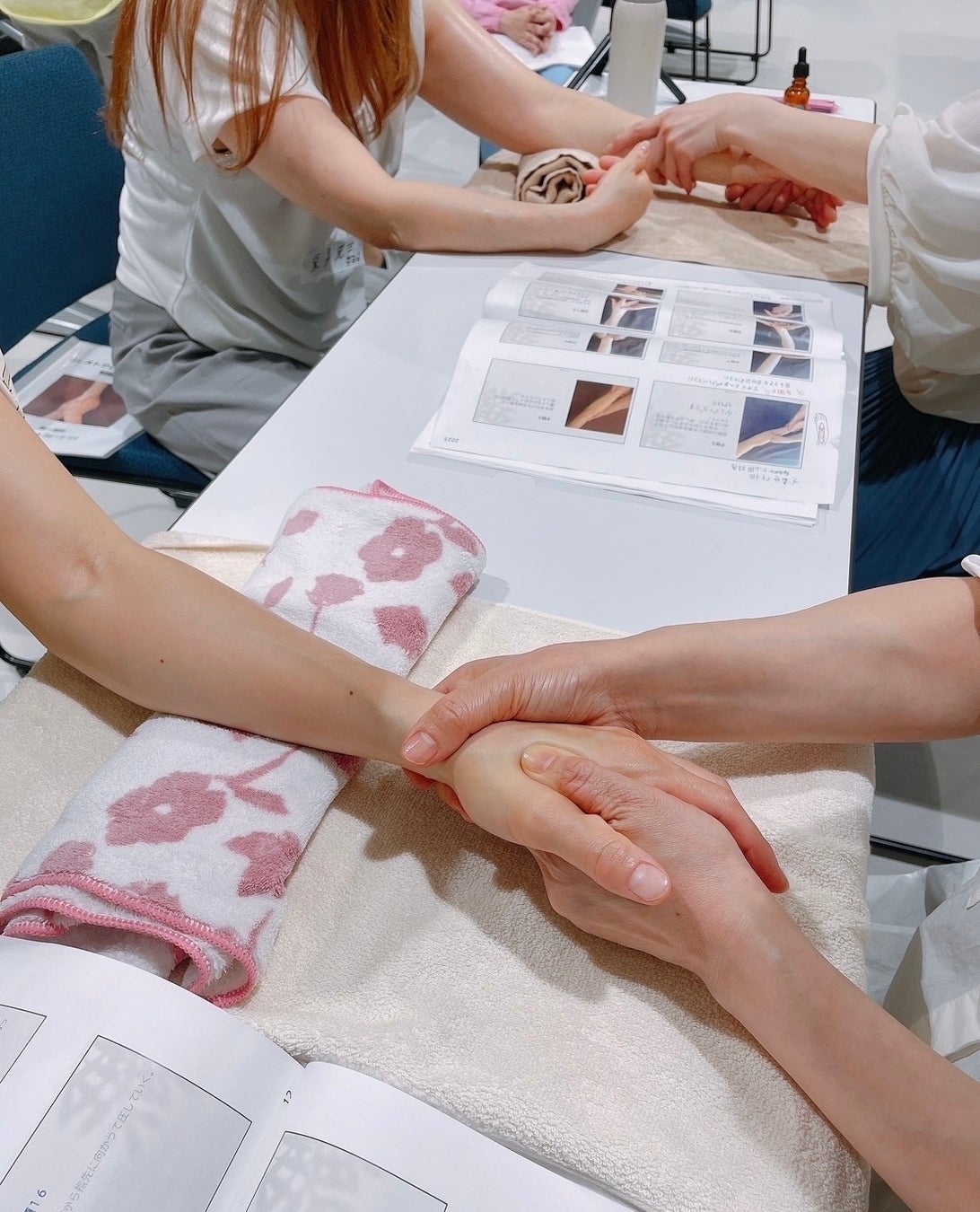 2日間約5時間の講座内で基礎知識とハンドトリートメントの実践等を学びます。
