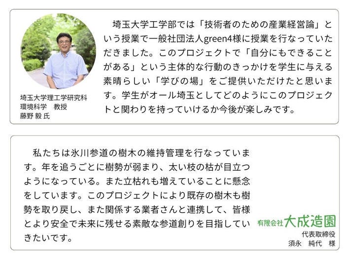 「氷川参道は地元住民の誇りであり、次世代に受け継ぐべき貴重な財産です。生態系豊かな森に再生し、人と自然が共存する理想的な都市の姿を目指します。ぜひ、多くの方にご参加いただきたいと思います。」