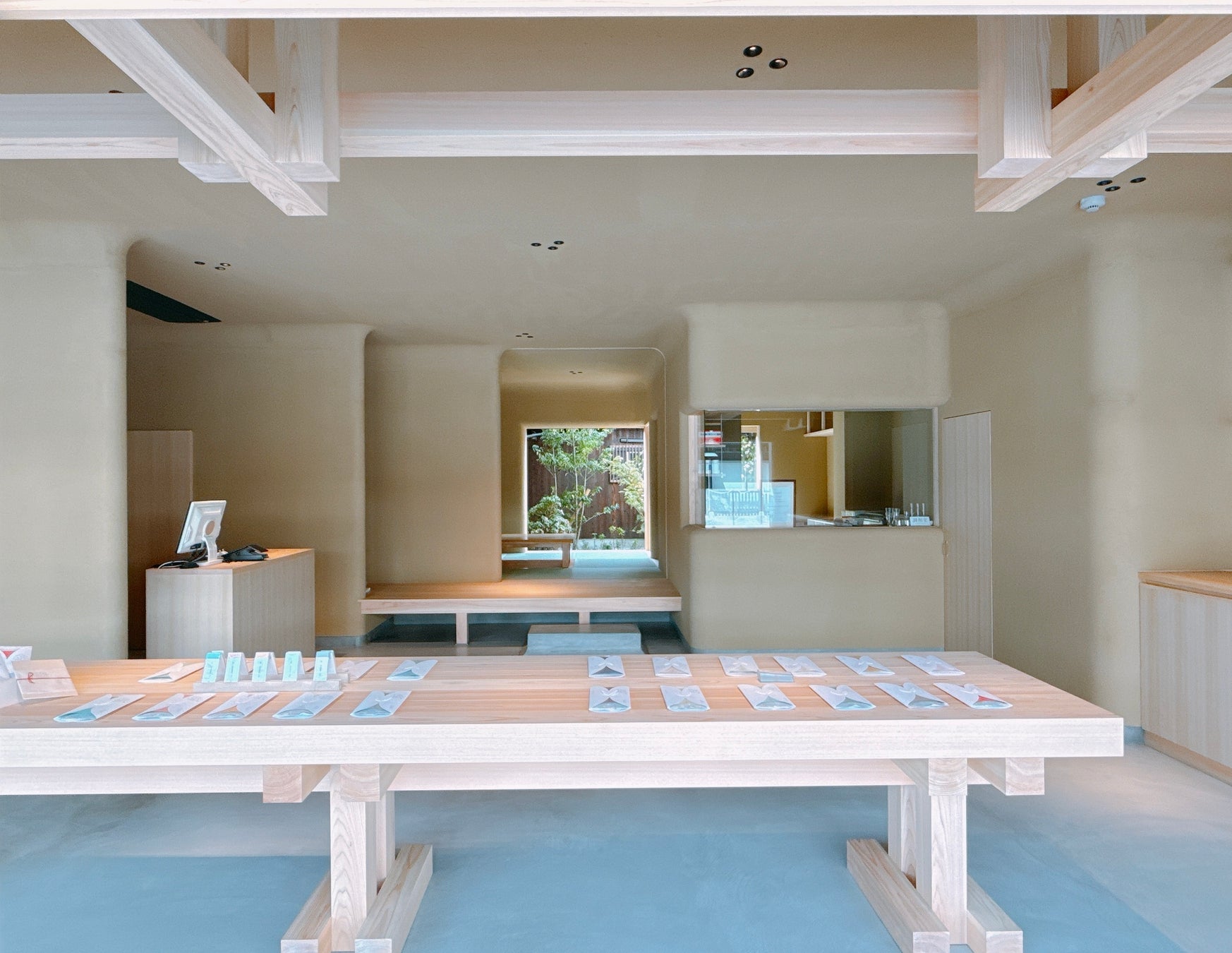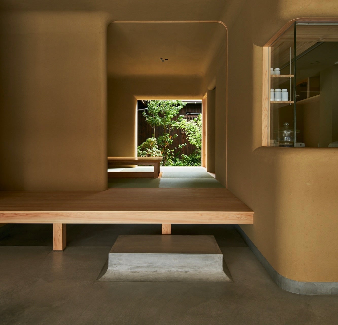 このリニューアルは創業100年を記念して行われたもので、設計・監理に京都での古民家改修の第一人者とも言われる魚谷繁礼建築研究所を起用、出雲市で伝統建築を得意とする石川工務店が施工を行いました。壁や天井を土壁の左官仕事で仕上げ、角部分はすべて丸みを帯びたR形状にすることで洞窟を思わせる静かでやさしい空間になっています。