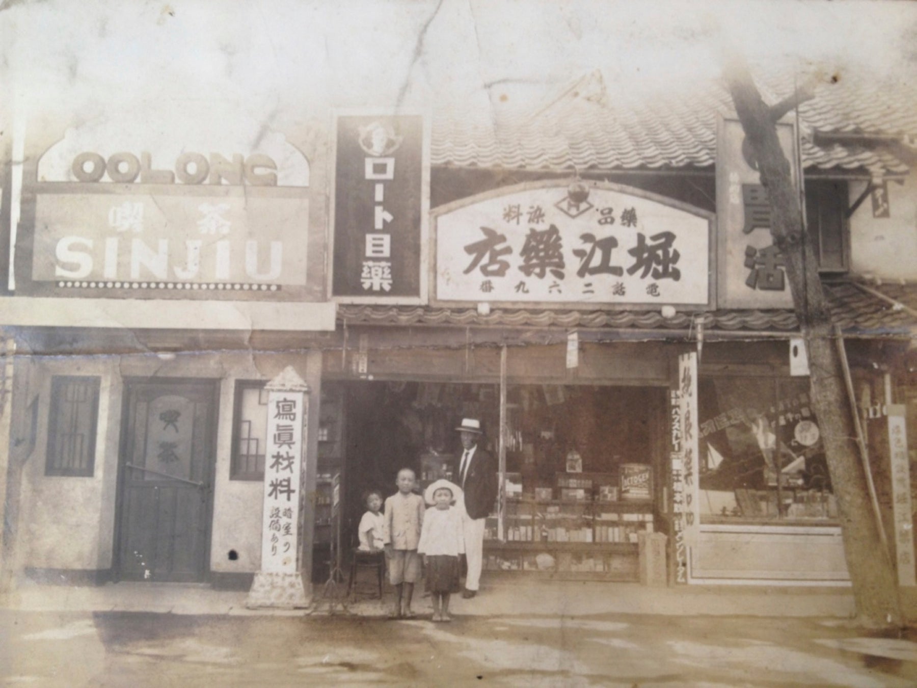堀江薬局のはじまりは初代・堀江健一が大正13年に現在地と同じ出雲大社 神門通りに創業した薬店です。地域に密着した薬店というだけでなく、喫茶店を併設していました。看板にはOOLONGの文字があり、医食同源の考え方からその頃にはまだ珍しかった烏龍茶などのお茶を提供していたことがわかります。大正時代には東京など都会地の有名薬局が喫茶室を併設することも多く、小さな田舎町でもそれに習ったのでしょう。いまに続く堀江薬局の和漢茶のルーツでもあります。