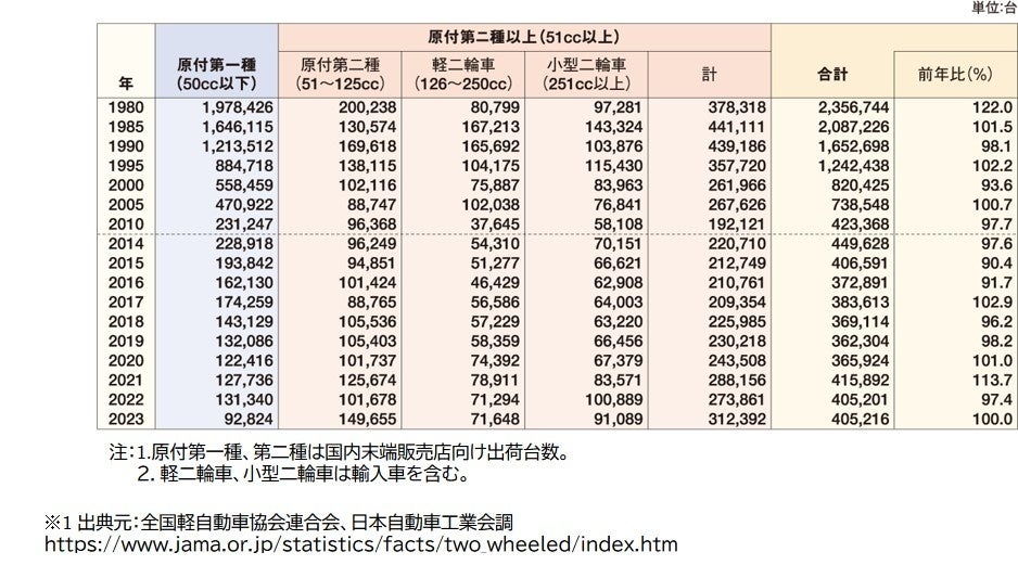 国内の二輪車販売台数は、2009年度の排ガス基準強化やリーマンショックの影響により、2010年度には42.2万台と大きく減少し、その後2015年度以降は30万台の水準で推移していましたが、2020年度の新型コロナ感染症拡大時期を境に増加に転じ、2021年度以降は40万台を超えています(※1)。