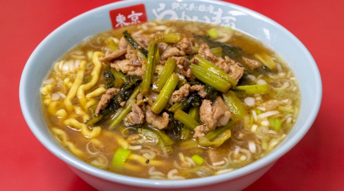 信州の野沢菜と豚肉を具材に独特のスープで煮込み、麺は特別に製麺した極太ちぢれ麺を使用した