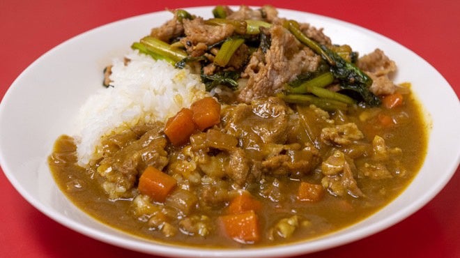 「マッスルらーめん」のカレー版とつや姫の無洗米を用いたこだわりカレーライス