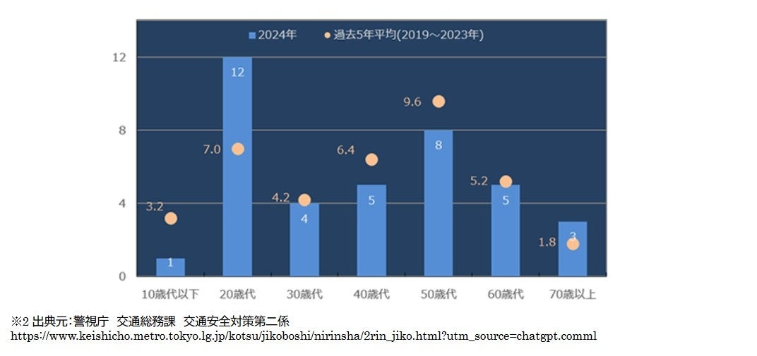 一方で、警視庁の調べによると(※2)、2024年中の東京都内の交通事故による死者数は146人(+10人)で、そのうち二輪車(原動機付自転車を含む)乗車中の死者数は38人(-6人)となり、都内の二輪車乗車中の死者数は、構成率で見ると全体の26.0パーセント(-6.4ポイント)を占め、全国平均の18.3パーセントを大きく上回る結果となっています。*()内は前年比