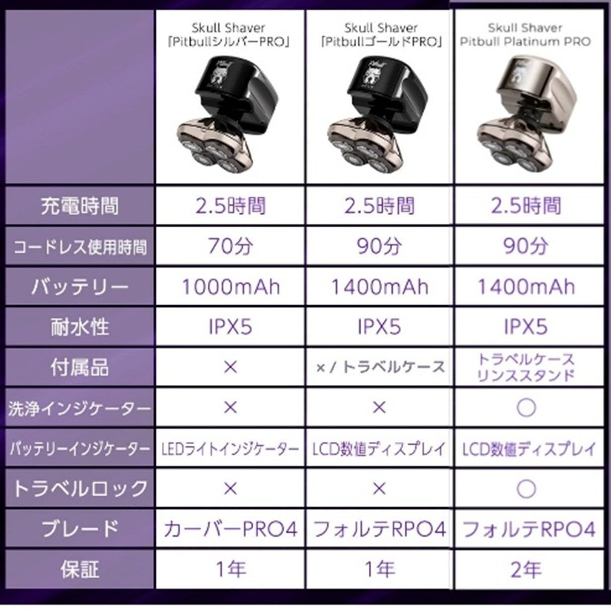 3.Pitbull Platinum PRO:最上位モデルで、標準髪質にあわせたForte Pro 4ブレードを標準装備。Goldの機能に加え、洗浄インジケーター、トラベルロック機能、プレミアムトラベルケース、リンススタンドが付属し、2年間の保証が提供されています。