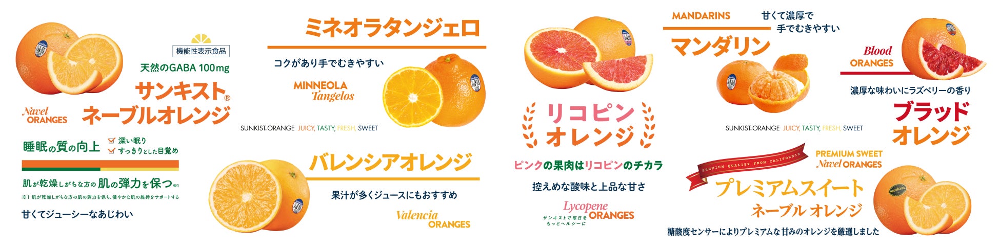 「サンキスト®オレンジ」には、甘くてジューシーな味わいの「サンキスト®ネーブルオレンジ」のほか、糖度センサーにより プレミアムな甘みのオレンジを厳選した「プレミアムスイート ネーブルオレンジ」、控えめな酸味と上品な甘さでリコピンも豊富な、ピンクの果肉が特徴の「リコピンオレンジ」、コクがあり手でむきやすい「ミネオラタンジェロ」、果汁が多くジュースにもおすすめの「バレンシアオレンジ」、濃厚な甘さで手でむきやすい「マンダリン」、濃厚な味わいにラズベリーの香りが特徴の「ブラッドオレンジ」の7種があります。