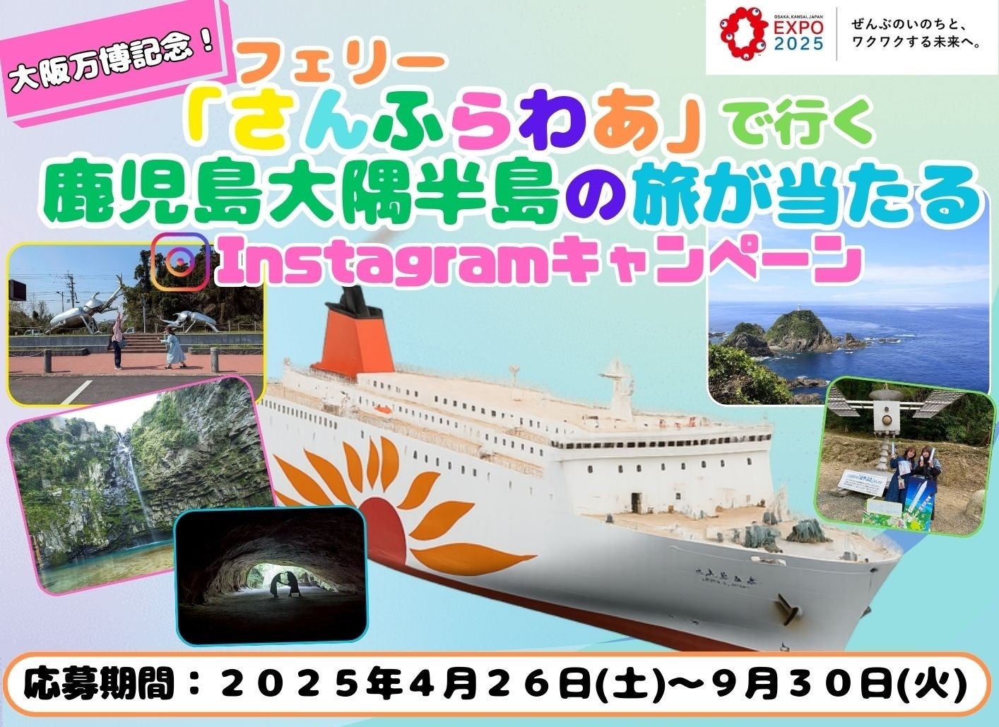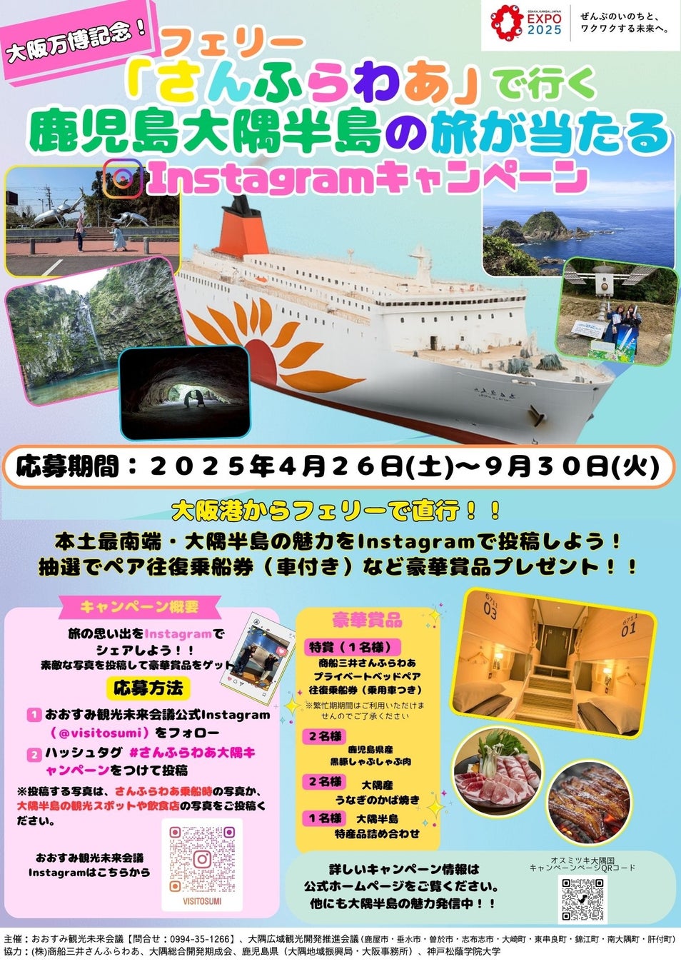 大阪万博開催を記念して、鹿児島県大隅半島のDMO(株)おおすみ観光未来会議では~大阪万博記念!!さんふらわあ魅惑のおおすみ旅Instagramキャンペーン~を開催いたします。