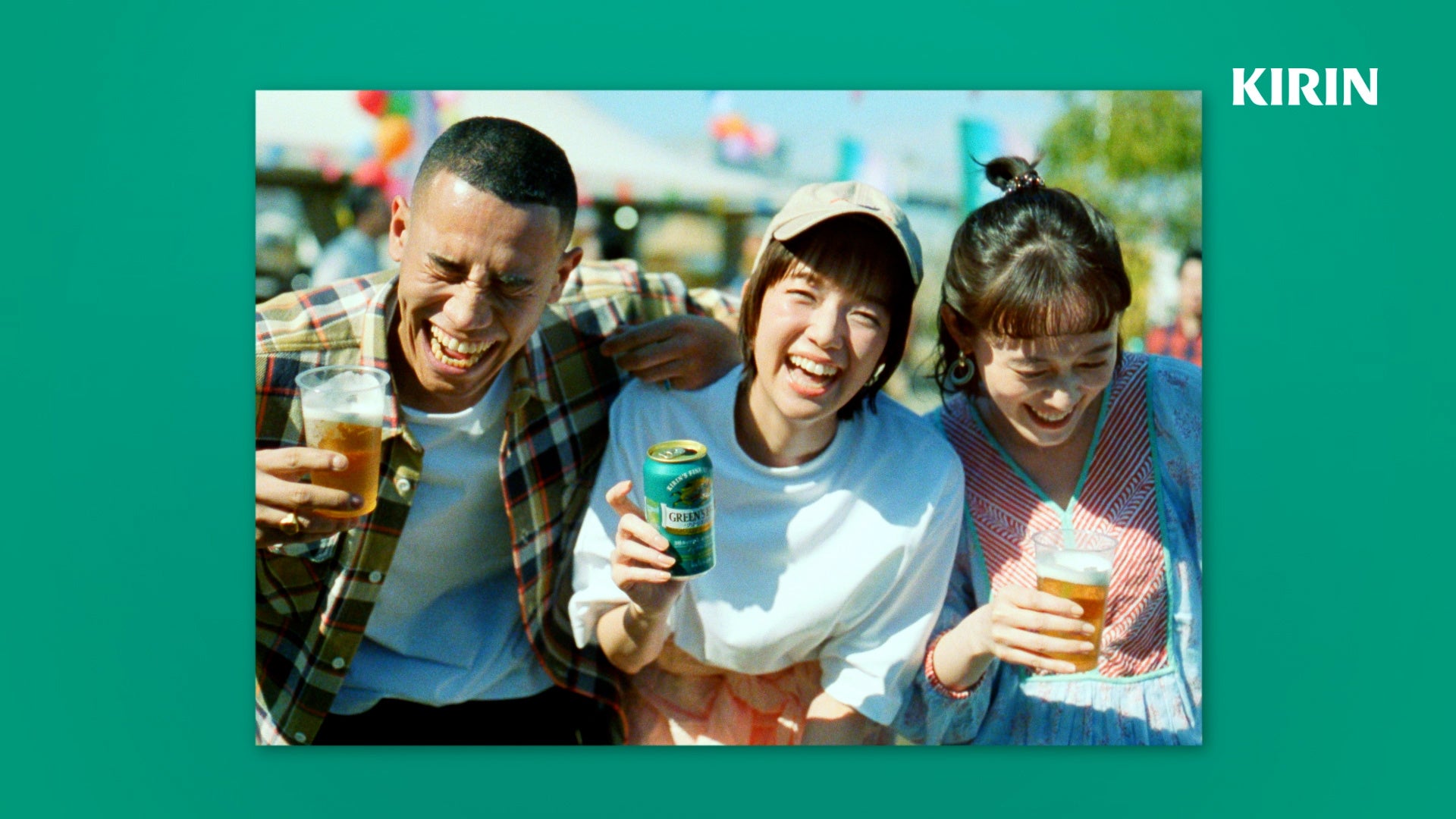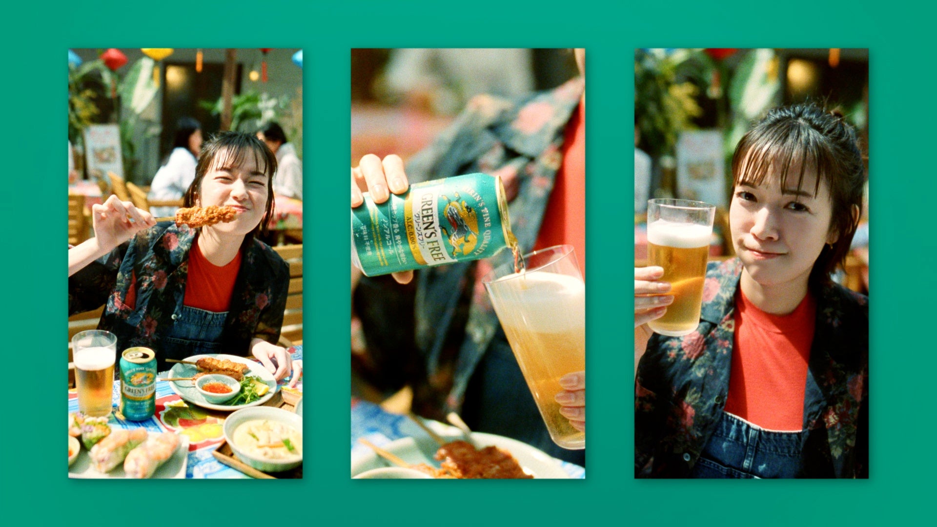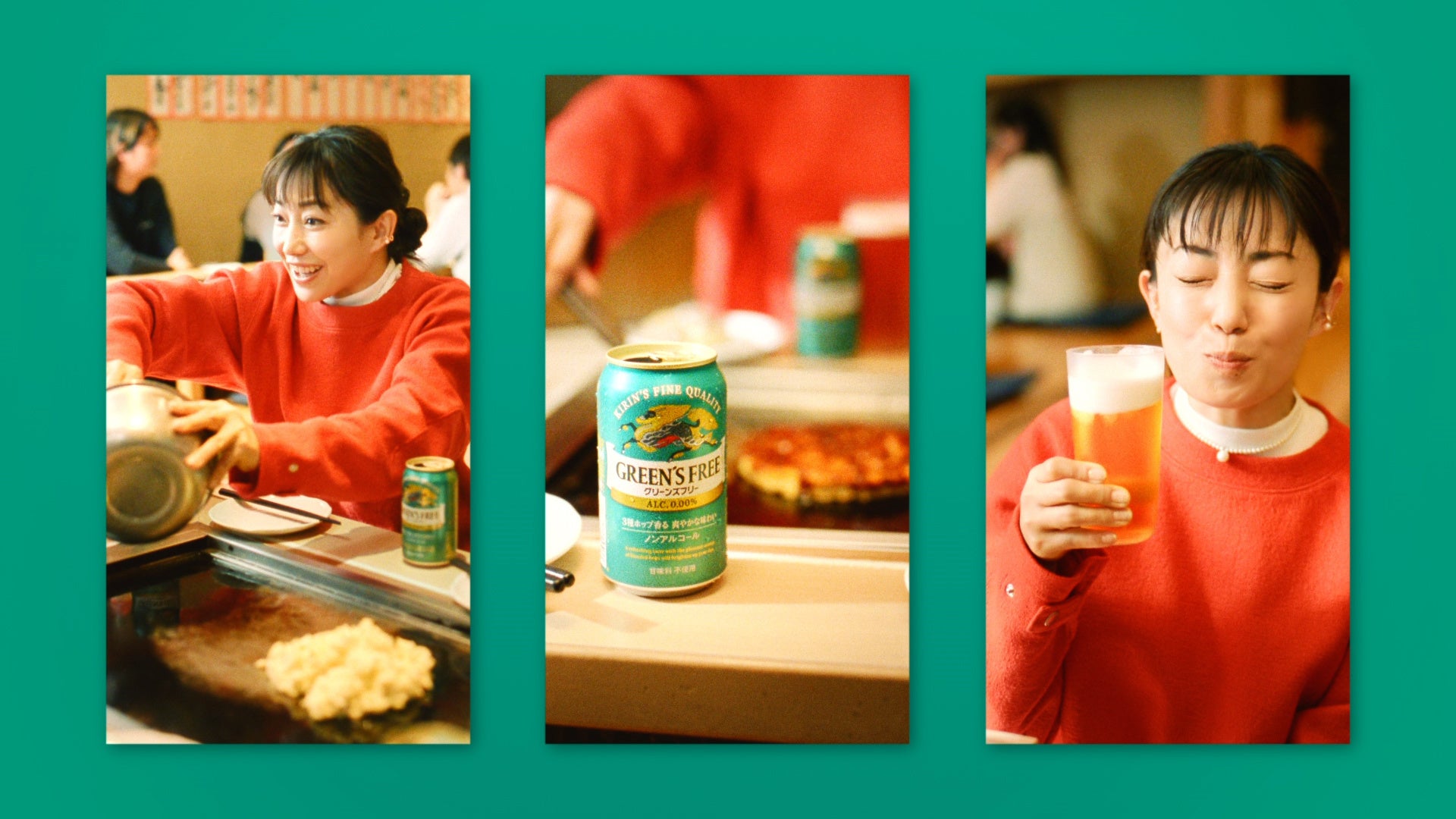 友人たちと温泉旅行中に浴衣姿で「グリーンズフリー」を楽しむ菅野さん。そこから、チキンを片手に味わっている場面やBBQを楽しむ姿、仲間とお好み焼きを焼きながら楽しむ様子も見られます。最後には「毎日をちょっと特別にする、うれしいノンアル。」というナレーションとともに自宅で「グリーンズフリー」を味わっている姿が映し出されます。それぞれの場面が思い出の1枚として写真に収められ、「グリーンズフリー」が日常に特別感を持たせることを伝えています。