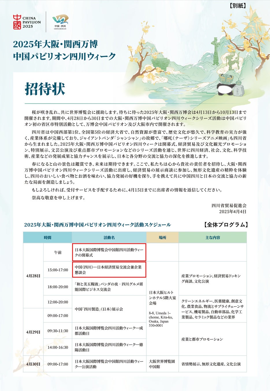 また、連携イベントとして、ビジネス交流会、子ども絵画展示、市(州)テーマデ―、四川物産展など複数のプログラムも開催予定です。