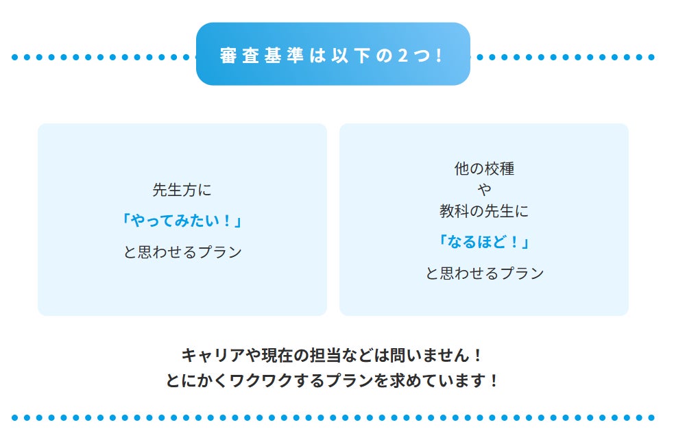 先生方に「やってみたい!」と思わせるプラン、他の校種や教科の先生に「なるほど!」と思わせるプランの2点が審査基準となる。