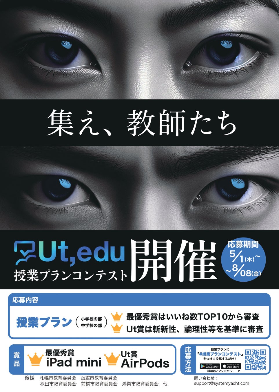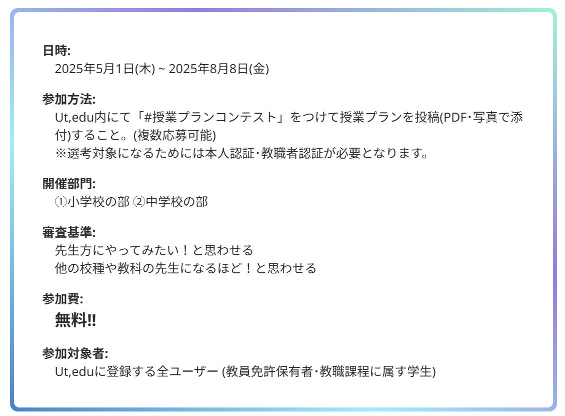 株式会社System Yacht(本社:埼玉県吉川市、代表取締役:佐々木瑛介)が運営する教職者専門プラットフォーム「Ut,edu」にて、授業プランコンテストが開催される。初回となる本コンテストは、小学校及び中学校向けの授業プランを対象に、ユーザーによる投票でTop10が決定され、その後現役教師や教授を含む運営サイドでの審査を経て最優秀賞・Ut賞を決定するという流れで行われる。