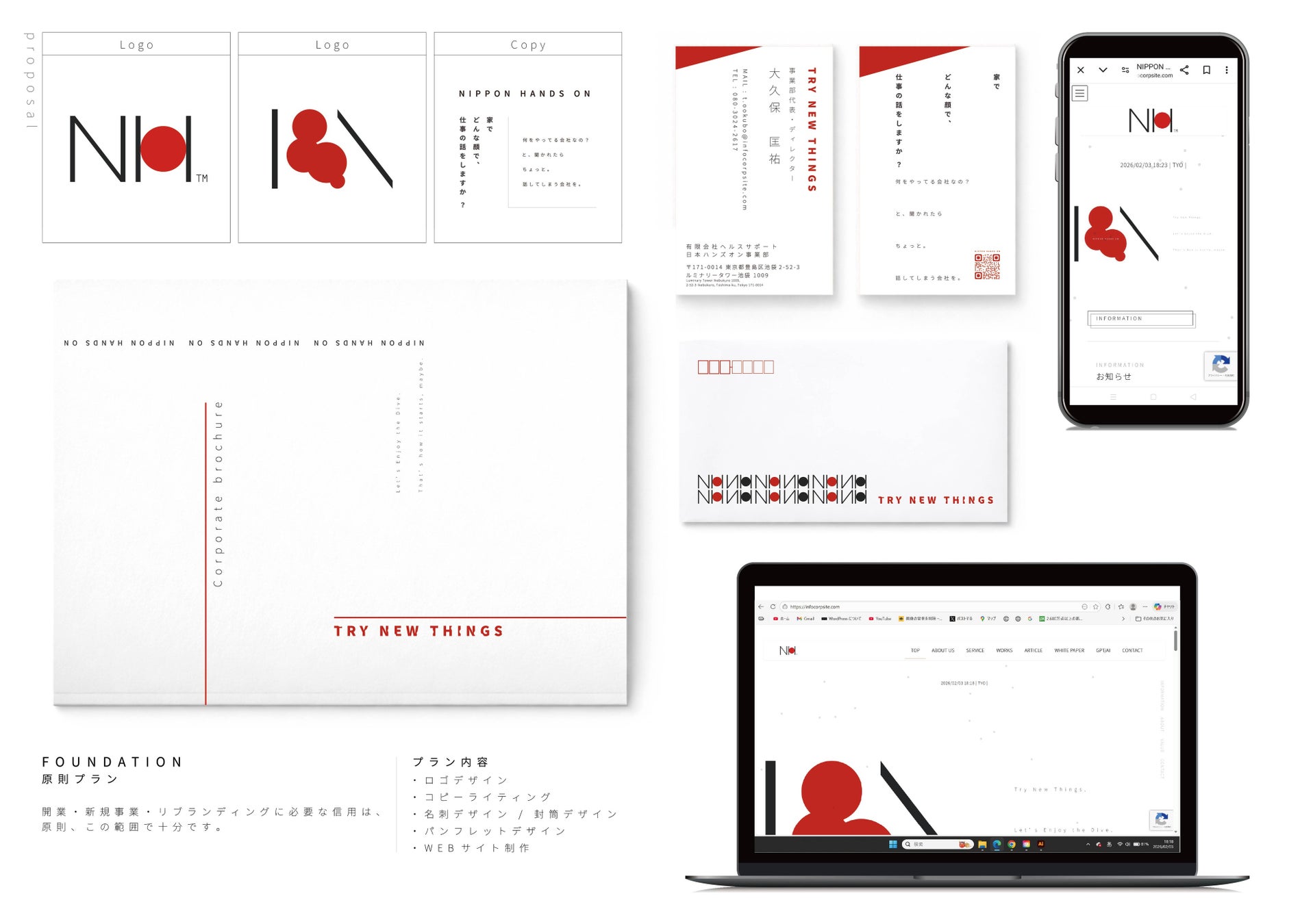 ロゴ、名刺、封筒、会社案内、コーポレートサイトなど、