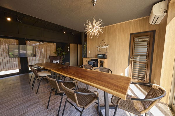 最大11名まで泊まれるワーケーション対応の「エリアA」と、少人数向け「エリアB」の2タイプを用意。バーベキュー・高級ユニットバス・高速Wi‑Fi完備で家族旅行から合宿まで幅広く対応