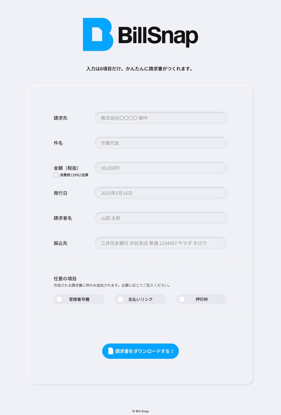 BillSnapは、これらの課題を解決するために開発されたツールです。必要事項をフォームに入力するだけで、ワンクリックでPDF形式の請求書を生成することが可能です。メール送信やダウンロードも簡潔に行えます。シンプルで直感的な操作性を追求し、フリーランスがストレスなく利用できるプロダクトを目指しています。