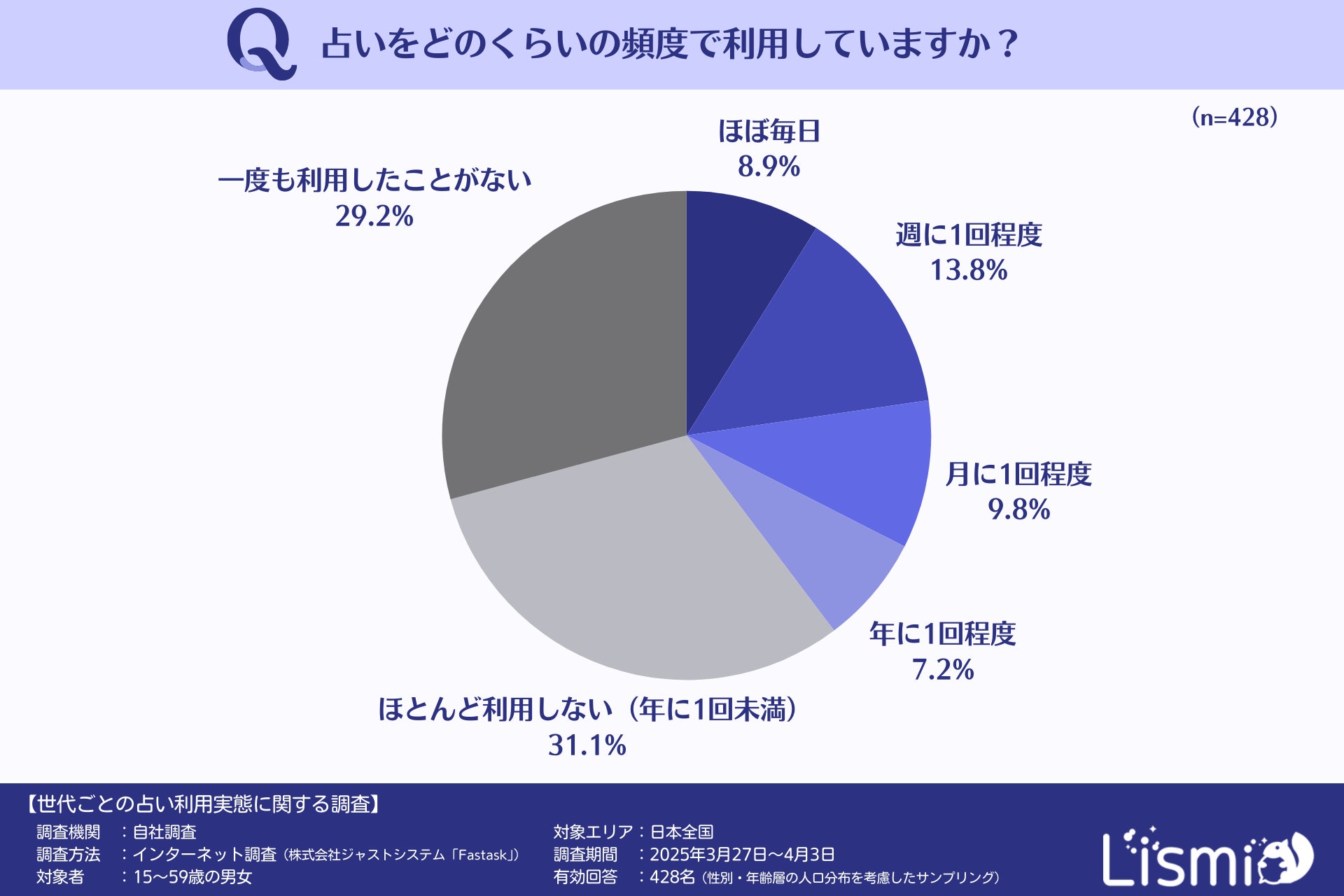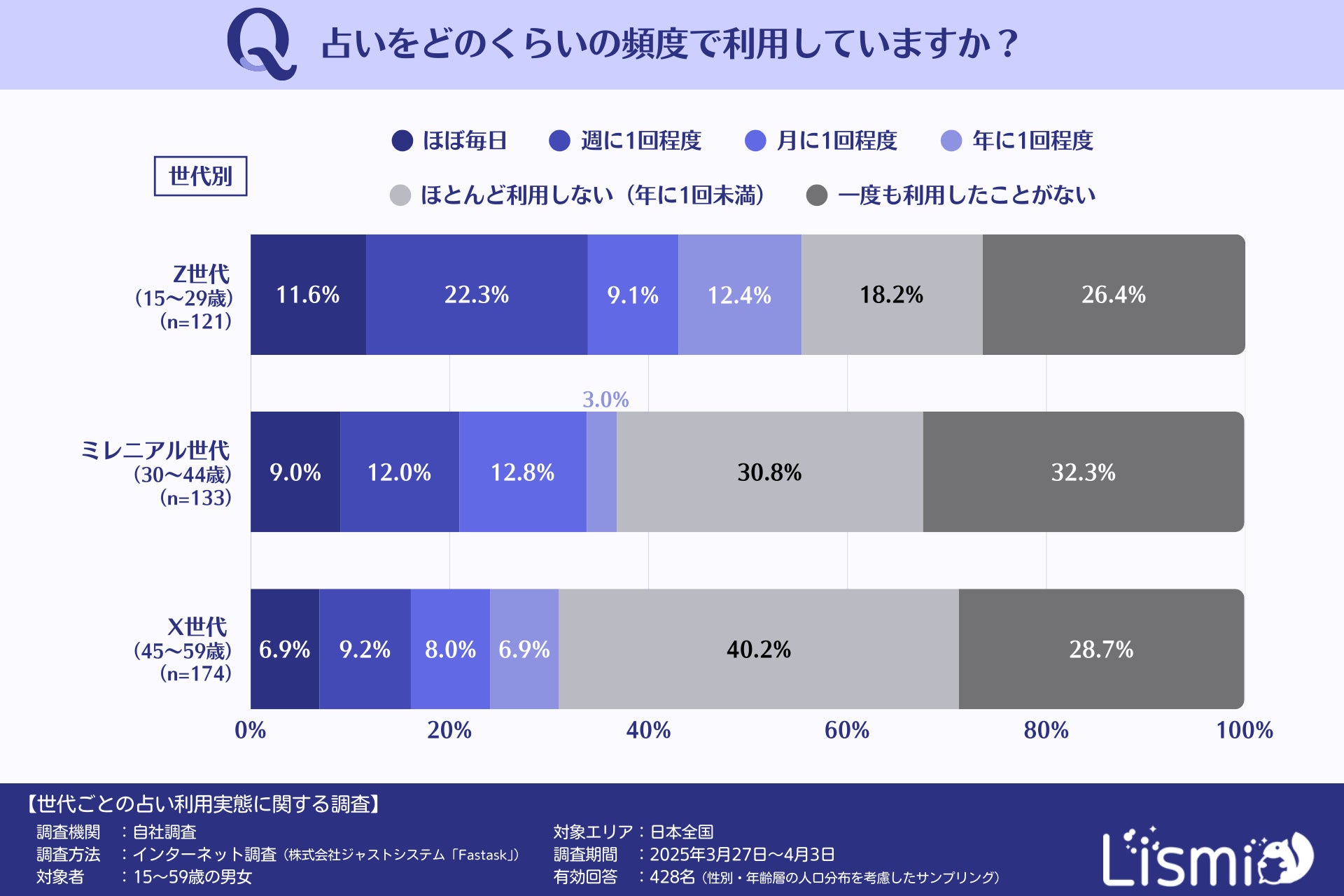 チャット占いアプリを提供する株式会社リスミィ( https://lismi.jp/ )(本社:大阪府大阪市、代表:池内康浩)は、世代ごとの占い利用実態を明らかにするため、15~59歳の男女428名を対象にアンケートを行いました。本調査では、Z世代が他の世代よりも占いを日常的に活用しており、SNSでの結果共有やスキマ時間の利用が特徴的であることがわかりました。