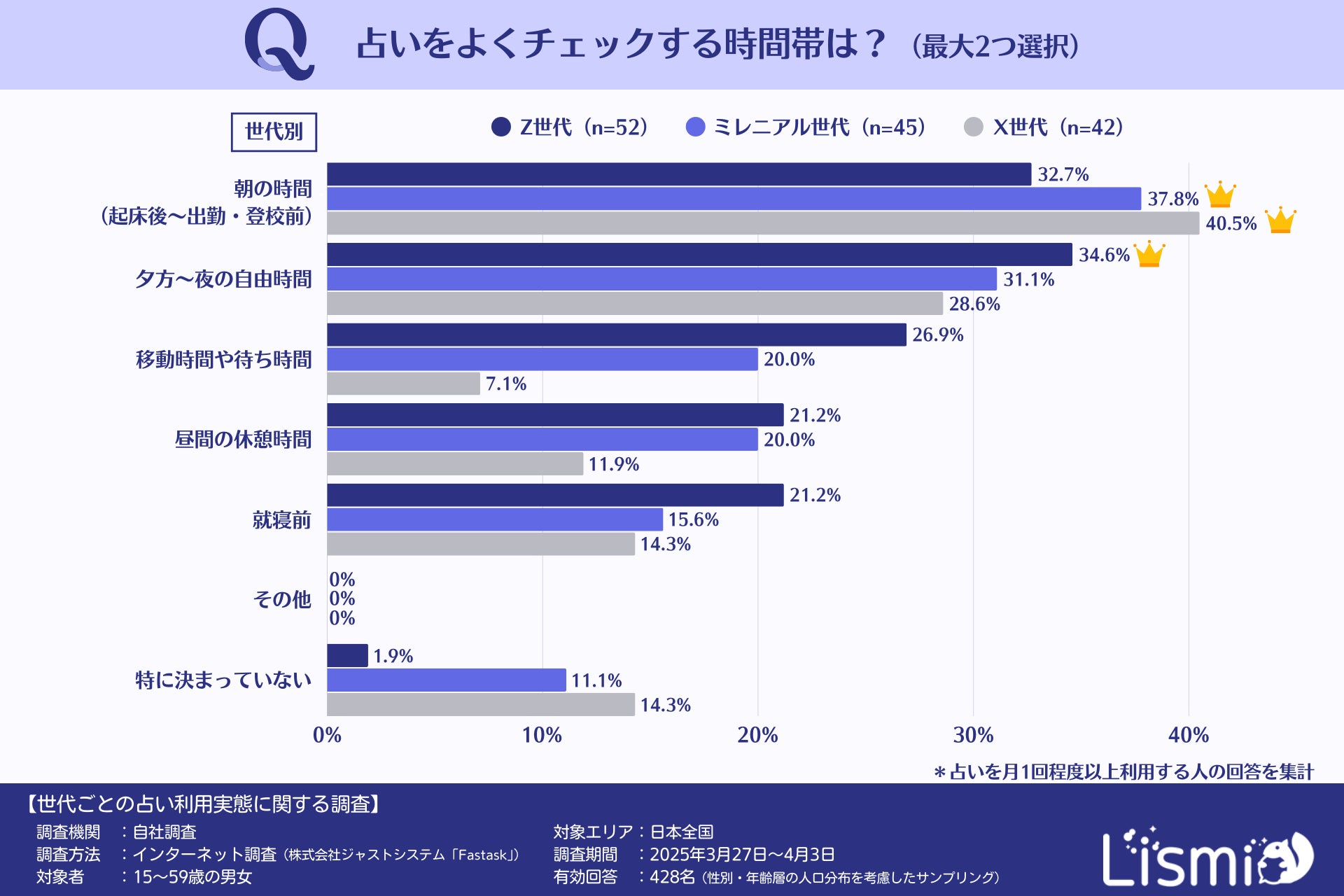世代別に見ると、X世代では「朝の時間」が40.5%と最も高く、Z世代では「夕方~夜の自由時間」が34.6%でトップとなっています。朝と夕方~夜は、世代に関わらず占いをチェックしやすい時間帯ですが、世代によって優先度が異なることがわかります。
