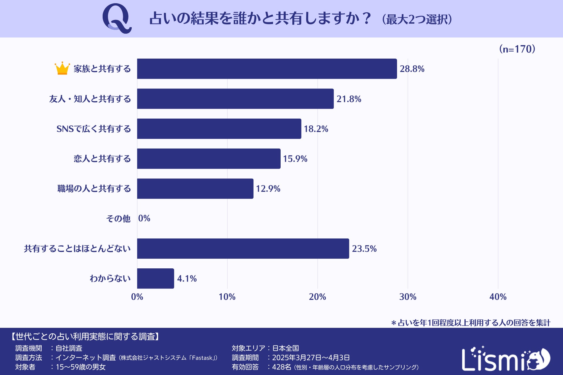 以下のグラフは、年1回程度以上占いを利用する人を対象に、占いの結果をどのように共有しているか質問した結果です。