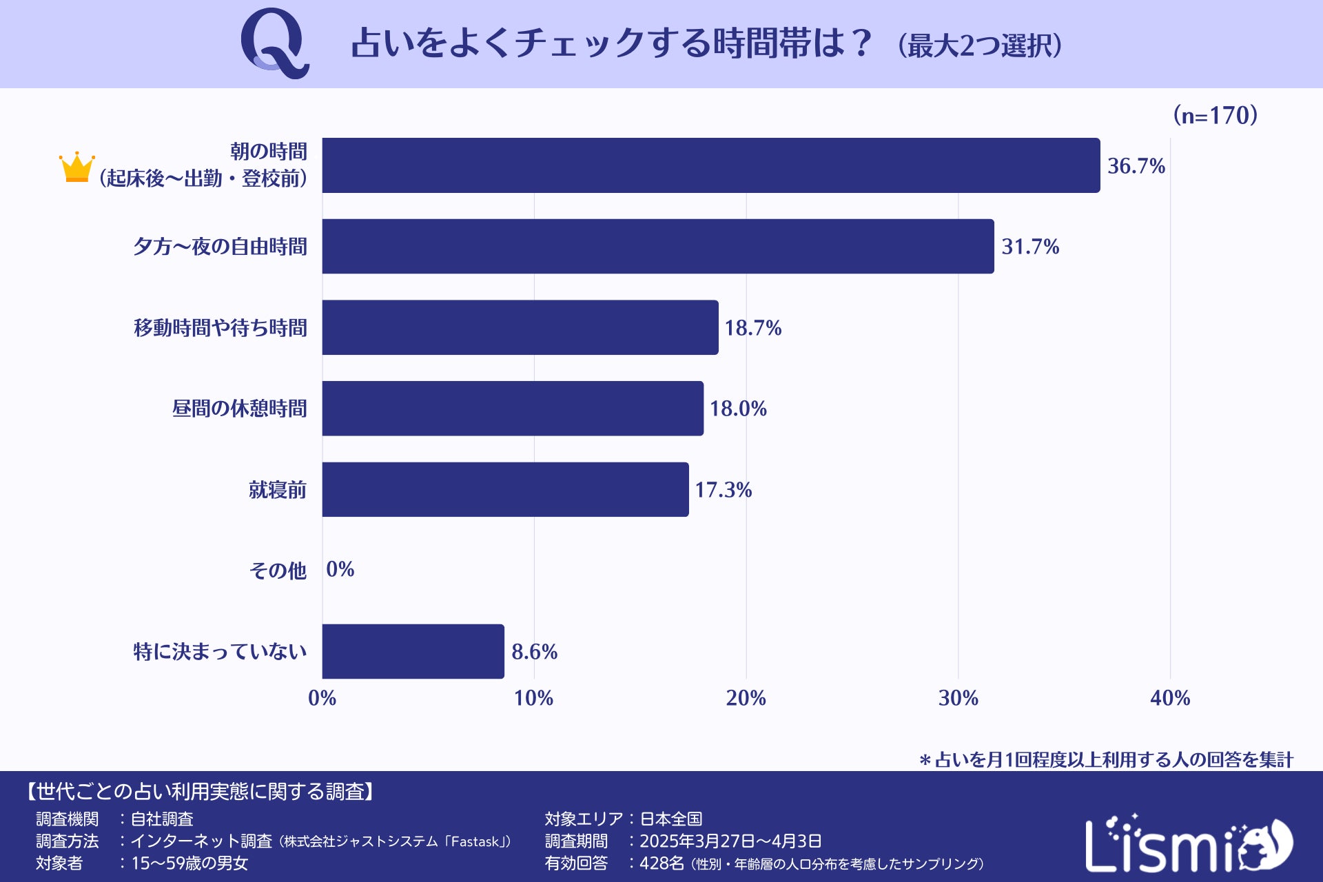 4.占いチェックは「朝の時間」が36.7%で最も多い、Z世代の26.9%は「移動時間」も活用