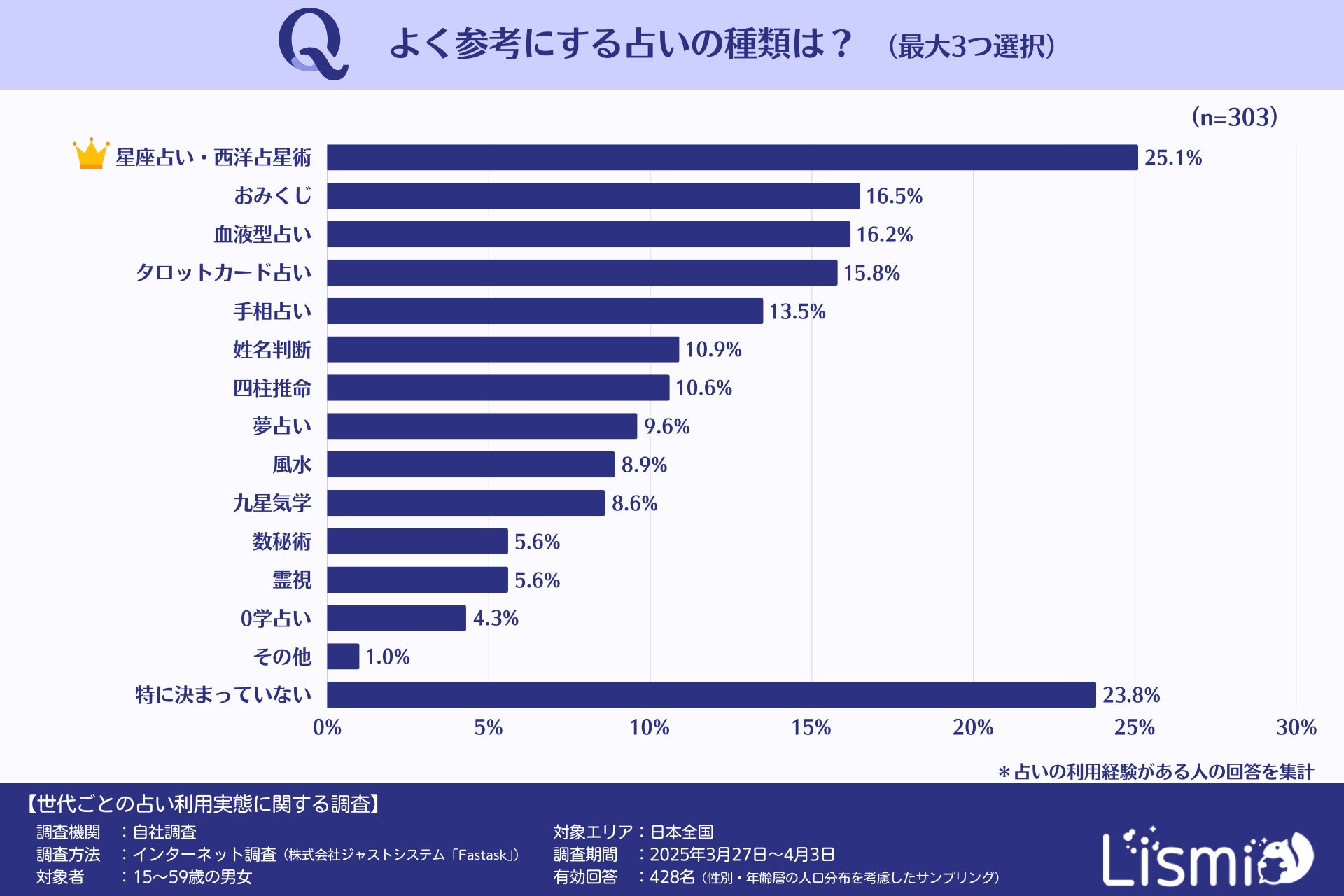 「星座占い・西洋占星術」が25.1%で最も人気があり、次いで「特に決まっていない」が23.8%、「おみくじ」が16.5%と続く結果になりました。「血液型占い」や「タロットカード占い」も16%前後で、高い人気を示しています。