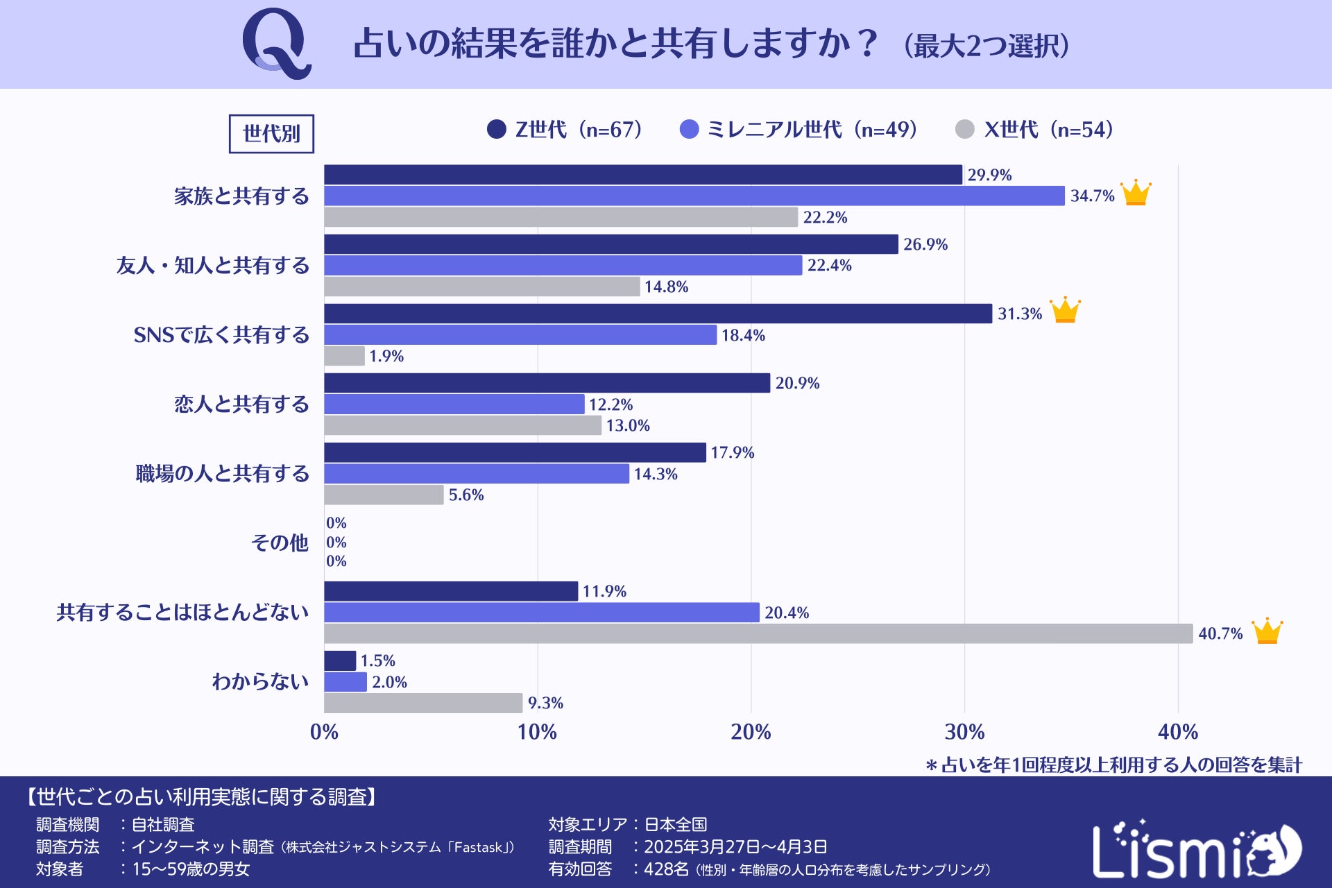このデータからは、占い結果の共有方法に明確な世代間ギャップが存在することがわかります。Z世代は様々な方法で積極的に共有し、中でもSNSを活用して広く情報を発信する傾向が強いのに対し、X世代は占い結果をプライベートな情報として捉え、共有することに慎重な姿勢を持つ傾向があるようです。