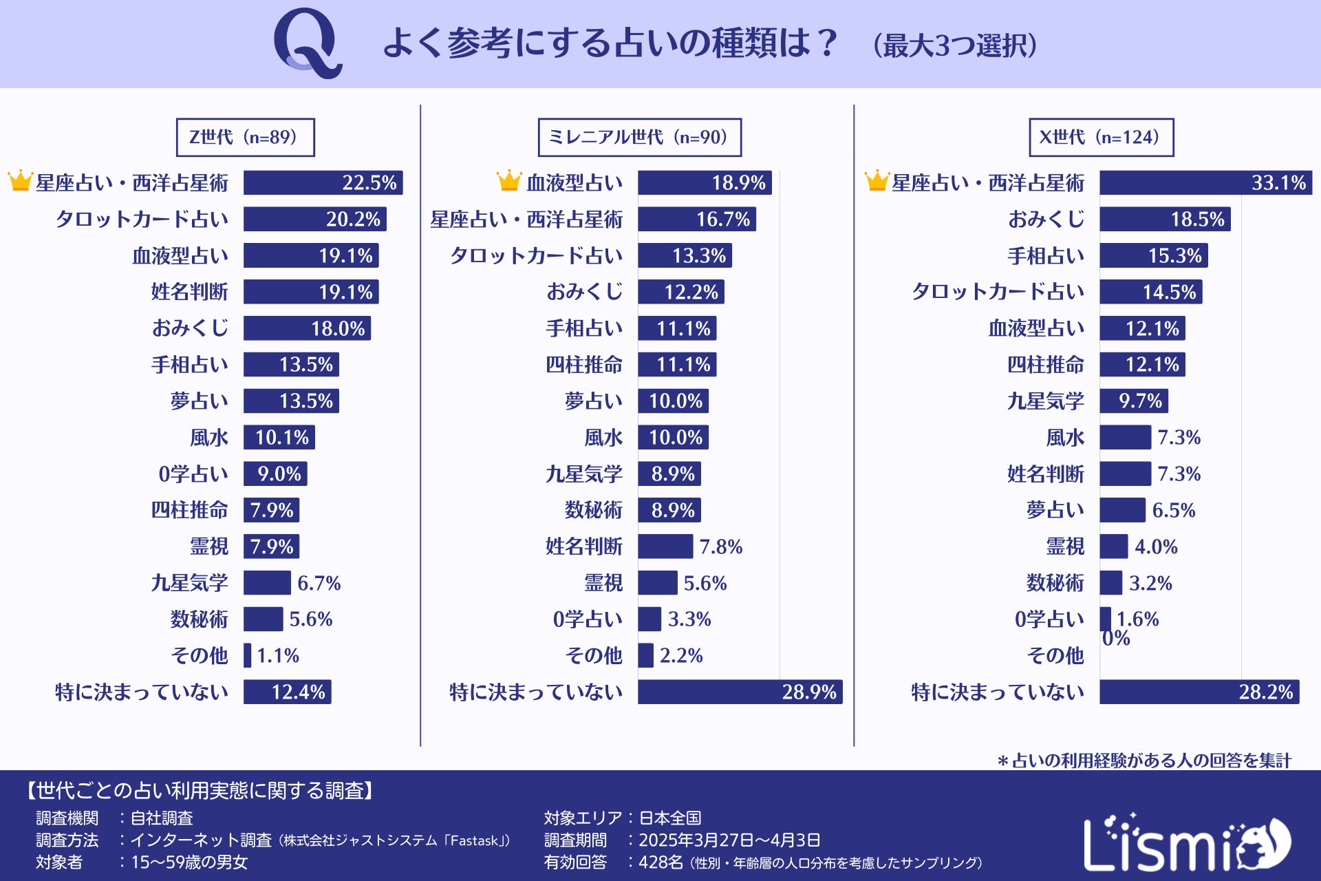 占いの種類の好みには世代差があり、Z世代はタロットカードや姓名判断など多様な占いに関心を持つ一方、X世代は星座占いへの根強い人気がある