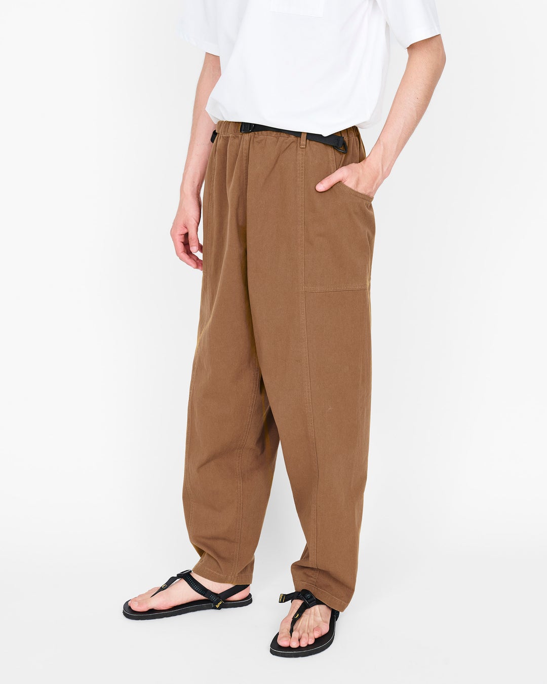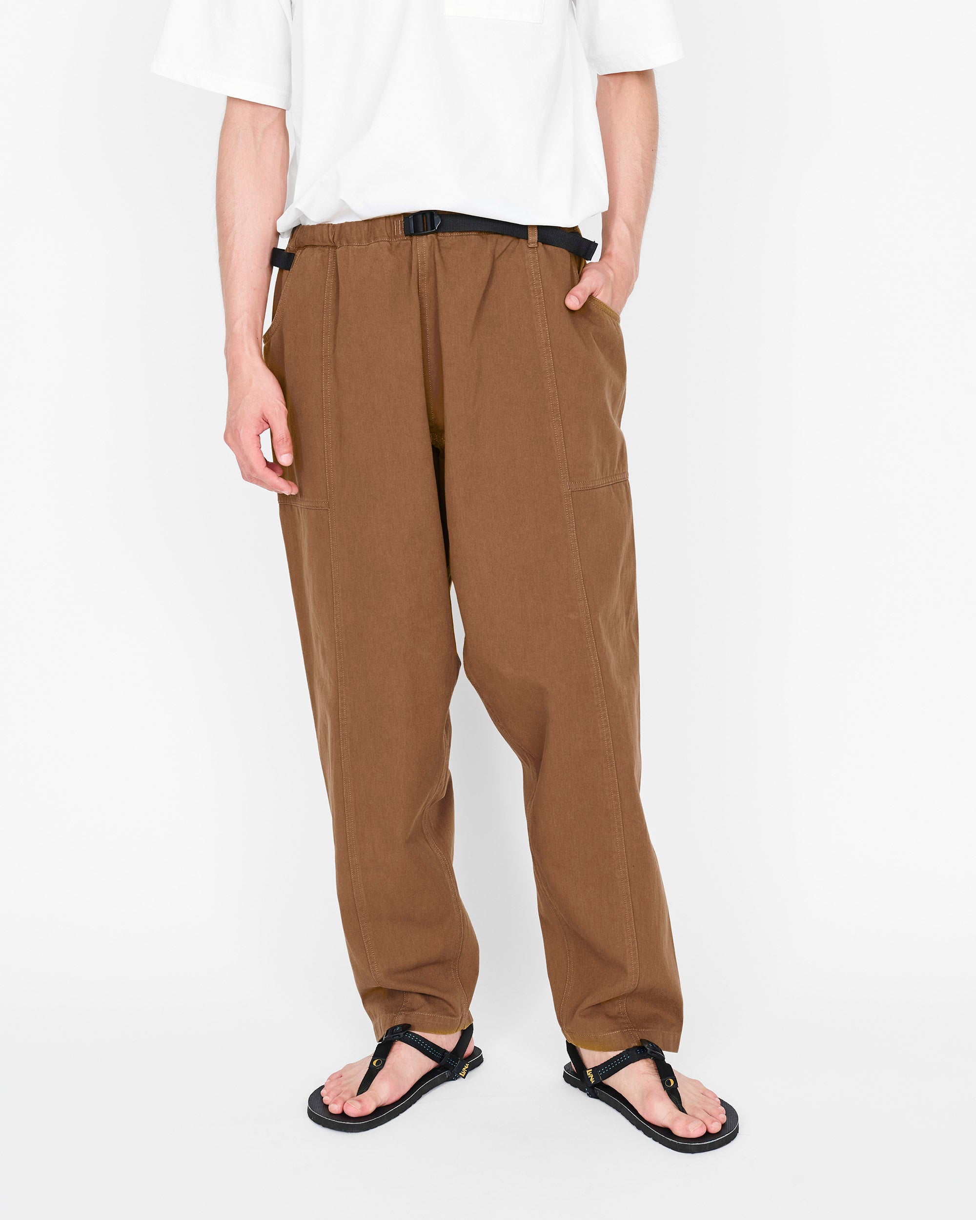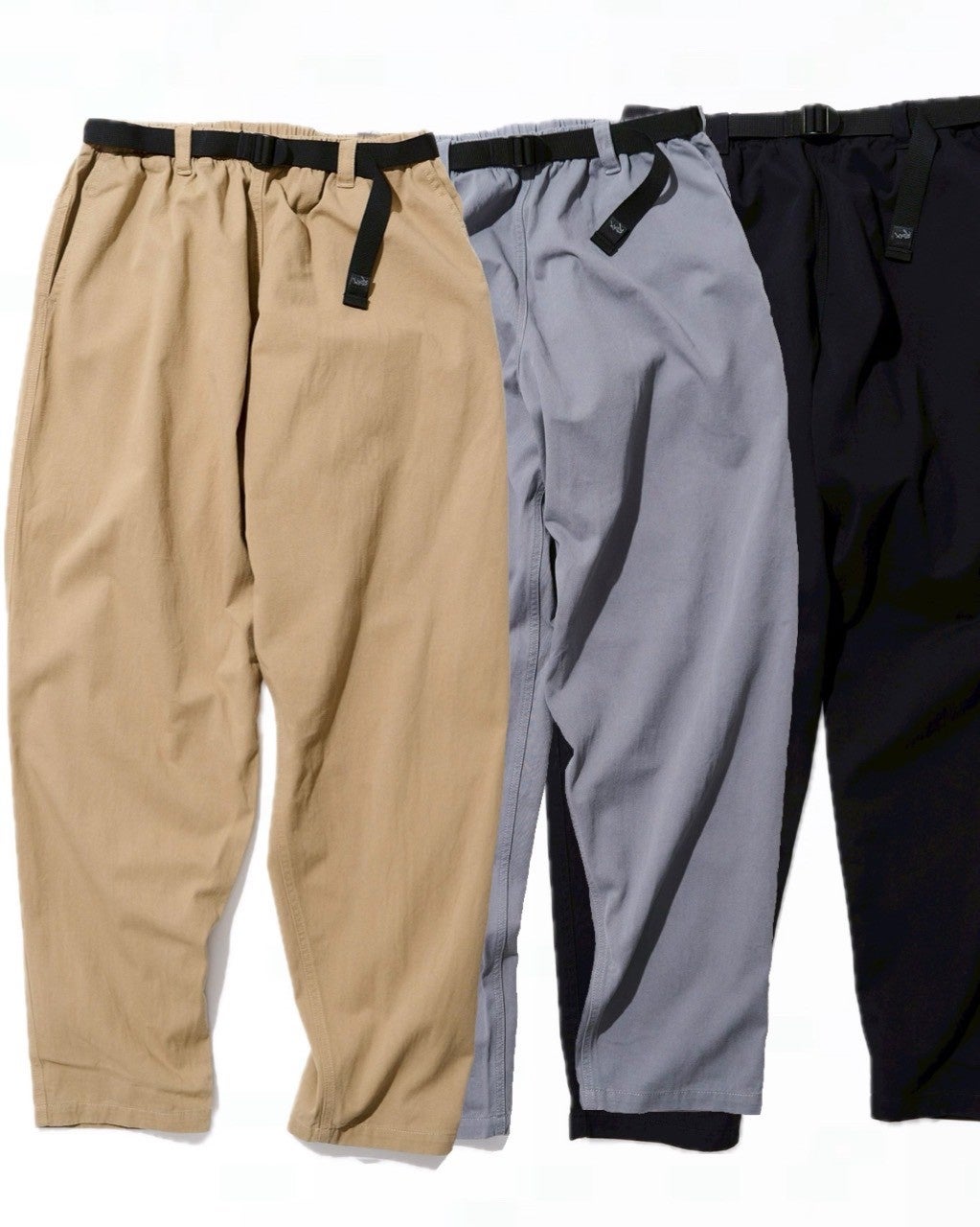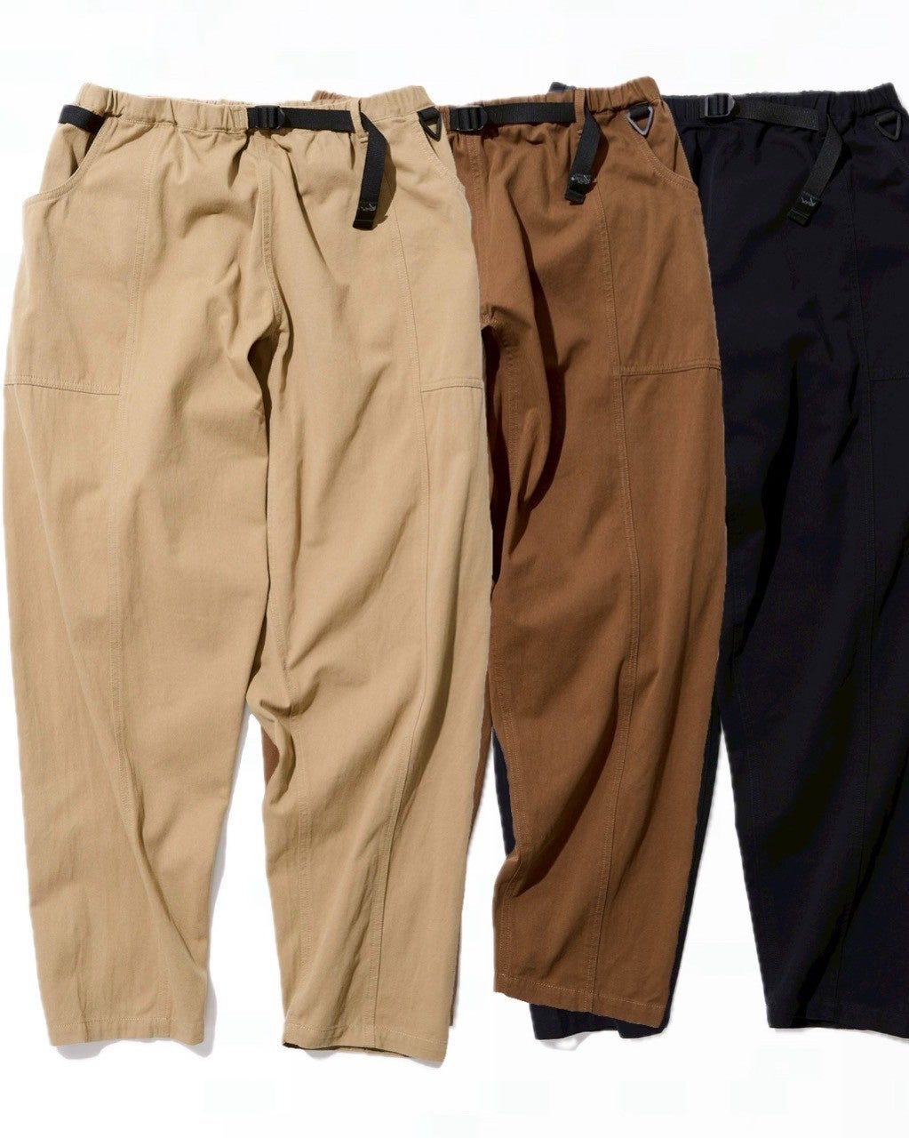 ウェビングベルトを表に出したデザイン、極太なシルエットなど、ほかにないディティールが目を引きます。裾はテーパードとなっているため、足元の邪魔をしません。