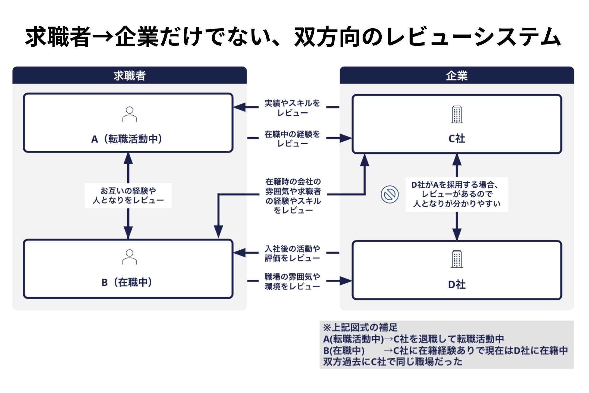 このような背景から、CAREER APTでは、企業は料金の上下を気にすることなく、転職者は他者からレビューを受けることでキャリアの構築・成長につなげることで、お互いの利益に結びつく転職・人材獲得ができる仕組みを提供しています。