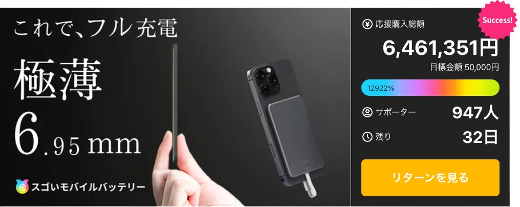 輸入物販事業を展開するJAPAN CROWDFUNDING(所在地:福岡県)は、「スゴいモバイルバッテリー Ver.2」の先行予約販売を応援購入サイトMakuakeにて開始し、わずか1週間で600万円を集めています。