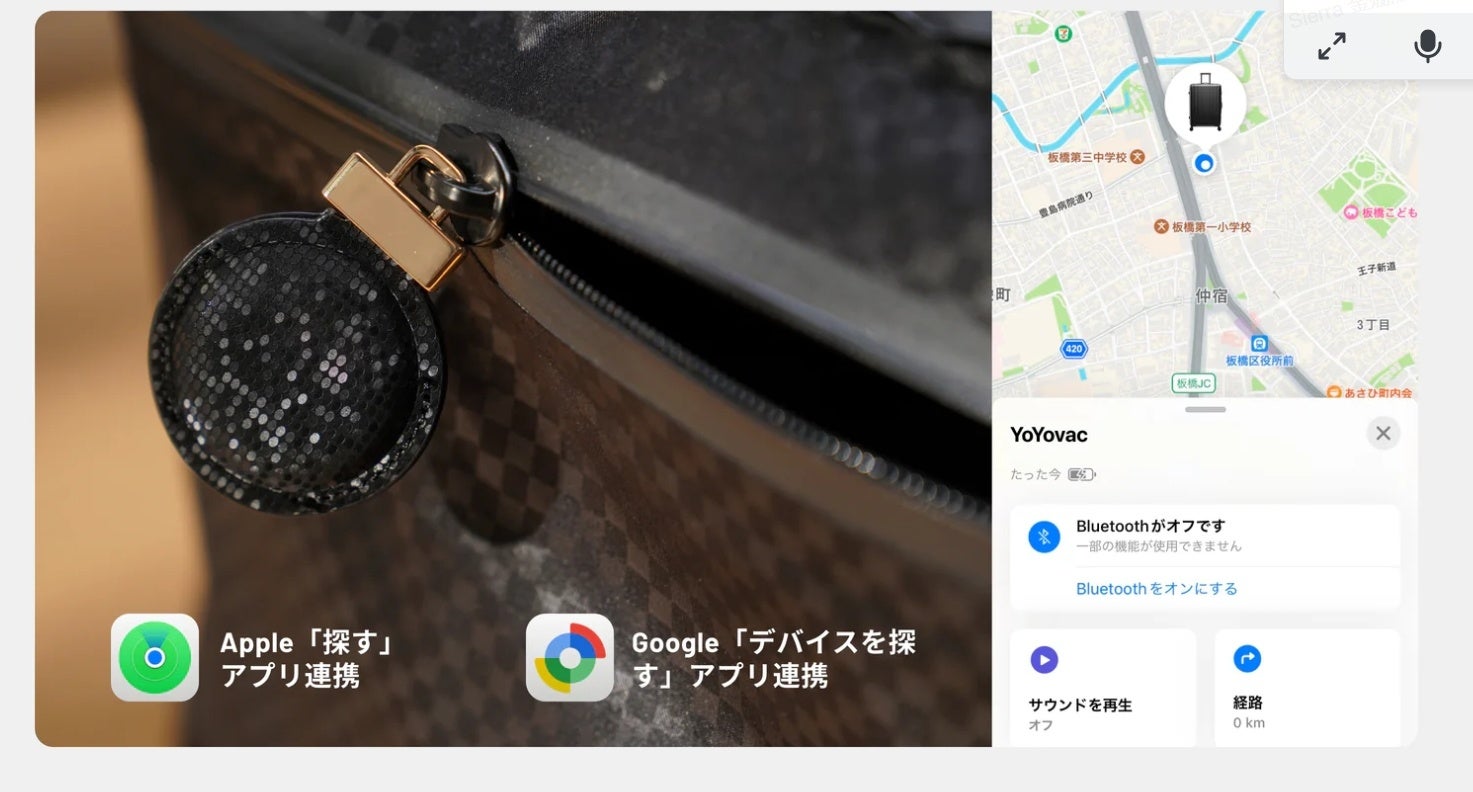 スーツケースの紛失や置き忘れの不安を解消。バッグのタグにはグローバルトラッキングタグ(追跡機能)が内臓。iPhoneの「探す」アプリ、Androidの「デバイスを探す」アプリと連携可能です。