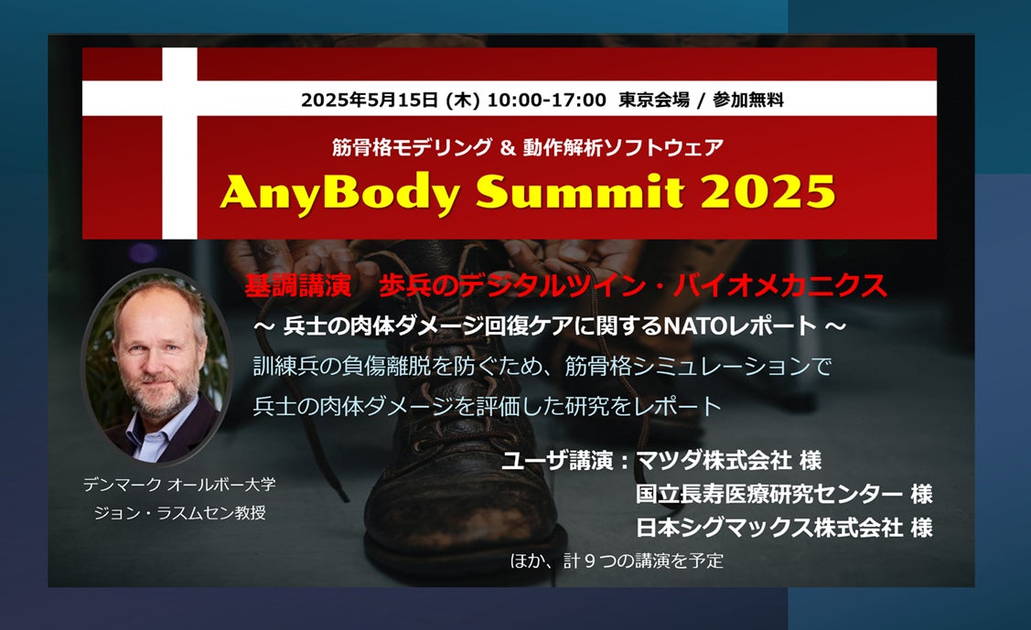 AnyBody Summit 2025には、筋骨格モデリング解析の第一人者、デンマーク・オールボー大学 ジョン・ラスムセン博士が来日して基調講演を行います。ロシア軍のウクライナ侵攻を受けて、欧州では人体シミュレーション技術の軍事応用に関する議論が活発化しており、基調講演ではNATO兵士の肉体損傷予防プログラムの開発に関するバイオメカニクス的アプローチが紹介される予定です。また、国内ユーザである国立研究機関、自動車メーカー、医療コルセットメーカーから応用事例の紹介が行われるほか、次期リリースに採用される新しいUI(ユーザ・インタフェース)が世界に先駆けて披露されるなど、最新情報が満載の無料イベントです。