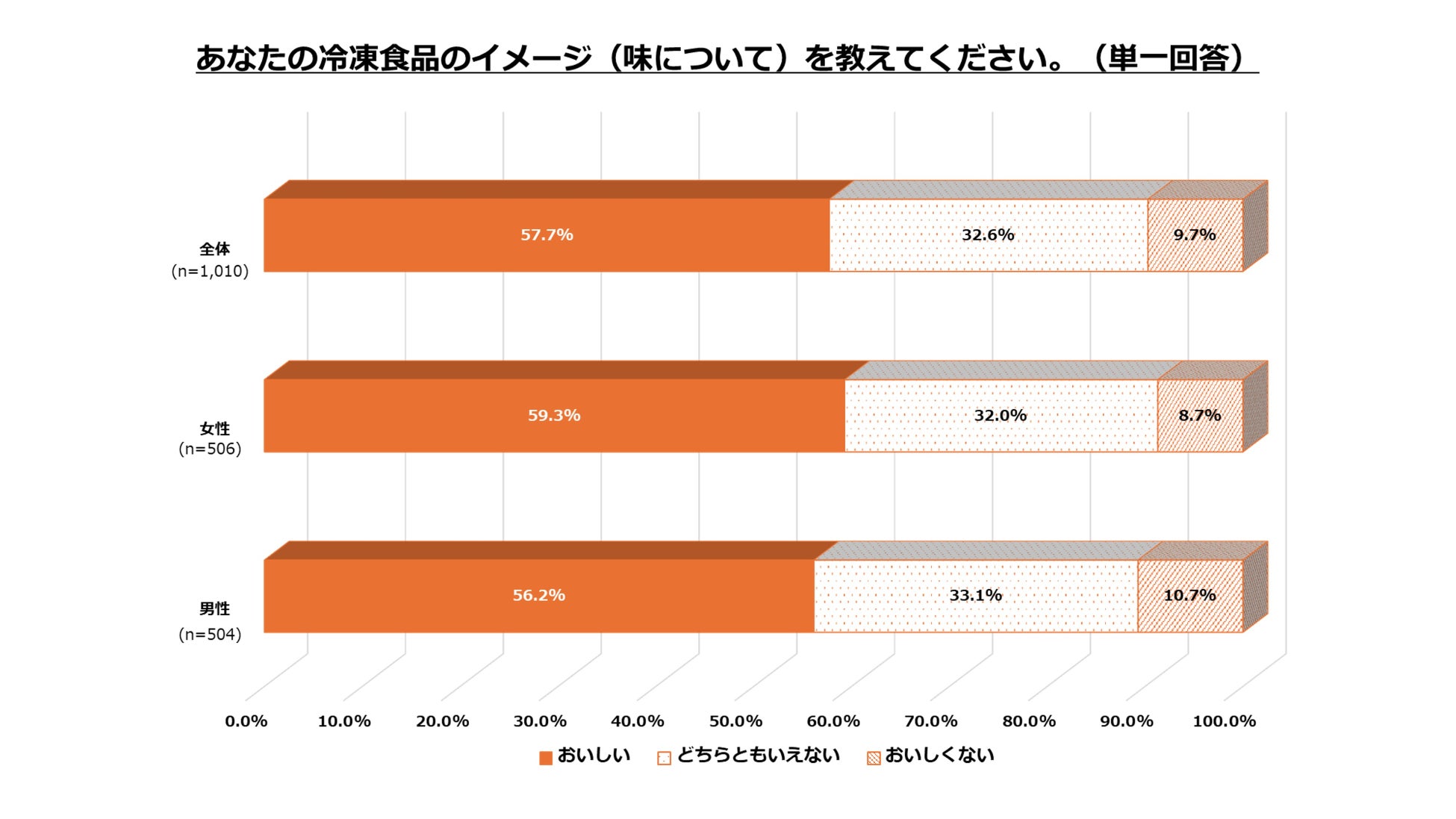 冷凍食品の味について、 「おいしい」と回答したのが全体で57.7%と5割を超える結果となった。性別ごとでも同程度の割合で、半数以上が味に対して「おいしい」と感じていることが分かった。
