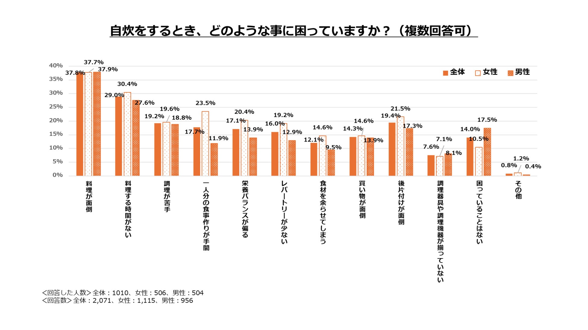②自炊の際の困りごとについて、全体で1位は「料理が面倒」(37.8%)2位「料理する時間がない」(29.0%)3位「後片付けが面倒」(19.4%)