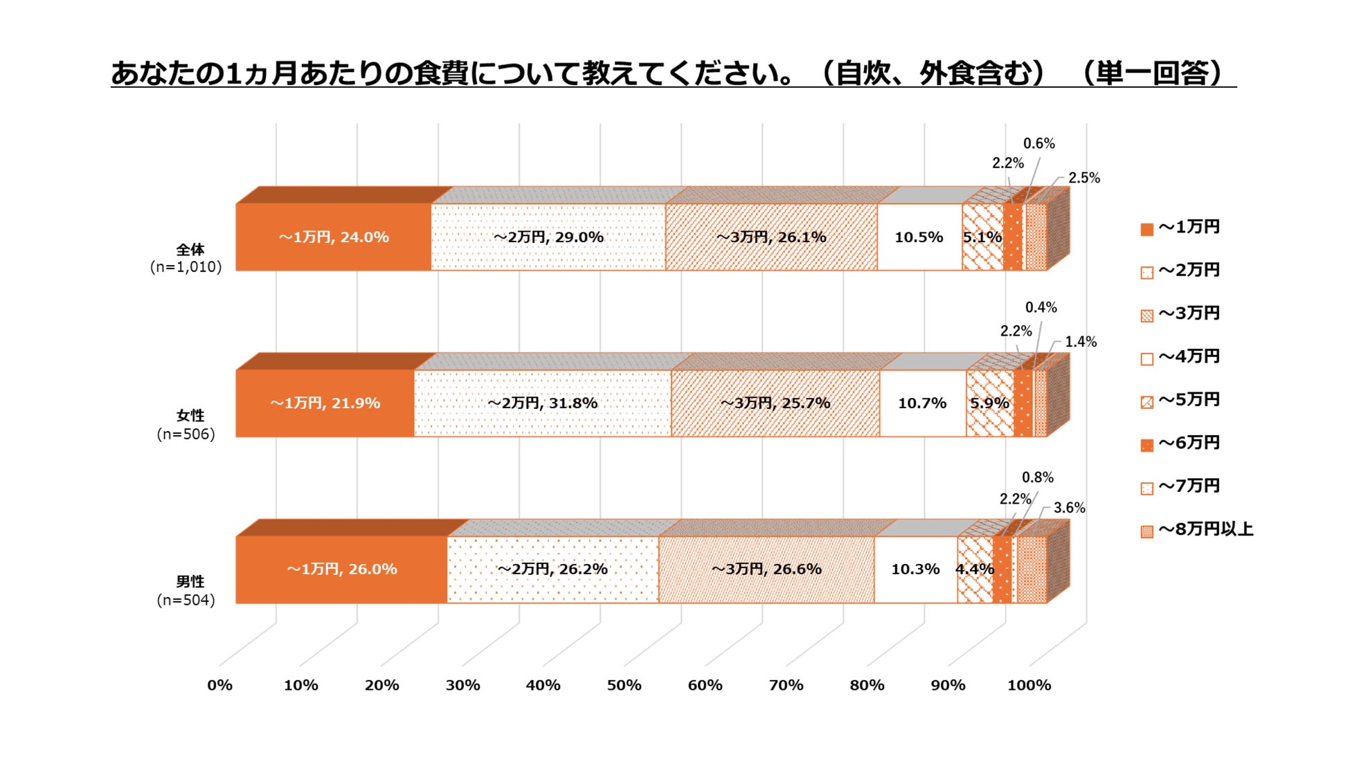1ヵ月あたりの食費について、「2万円以下」が半数以上の53%、全体の約4人に1人は「1万円以下」(24%)でやりくりしていることが判明しました。