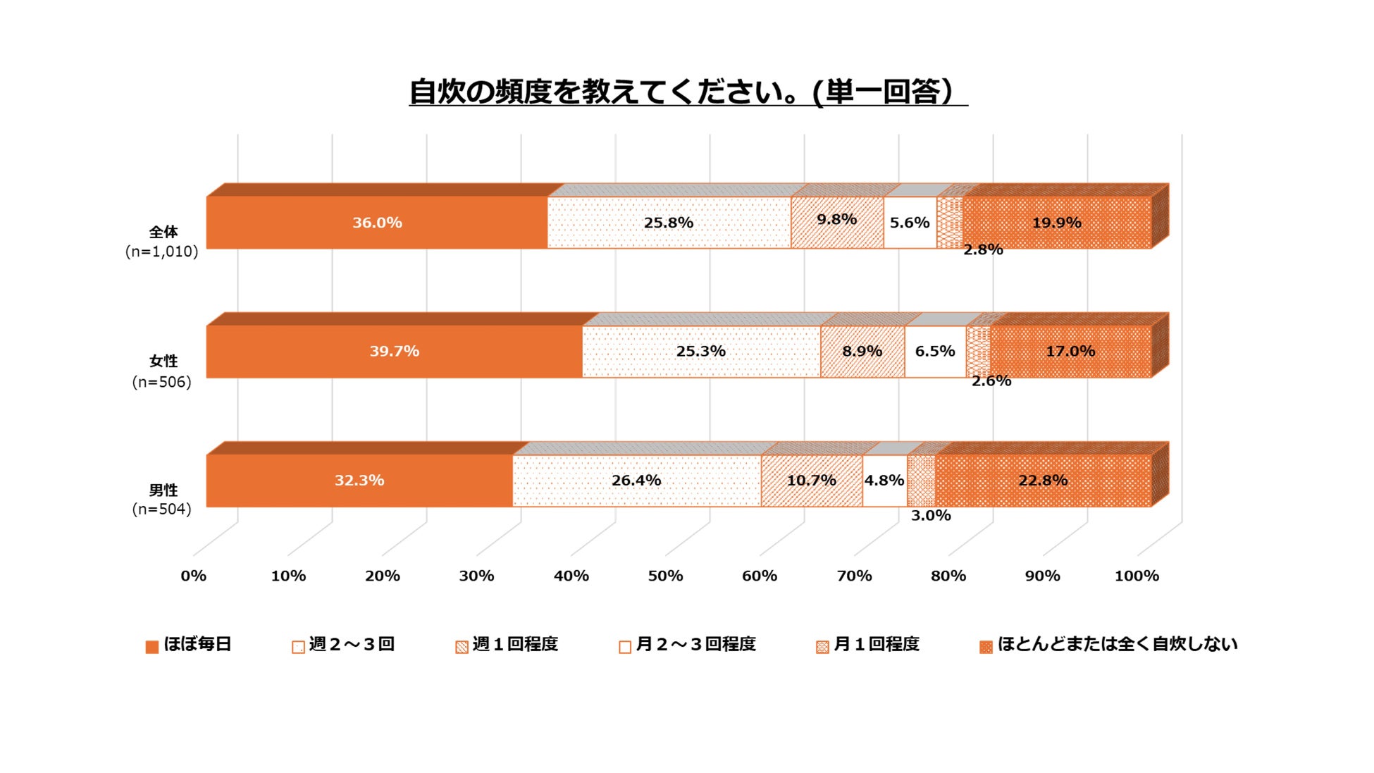 自炊の頻度について、女性も男性も「ほぼ毎日」と答えた人が多く、全体で36.0%。一方、「ほとんどまたは全く自炊しない」は女性で17.0%、男性で22.8%と3番目に多く、自炊をしない人は全体では2割弱いることが分かりました。